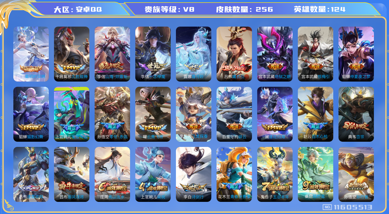 [11605513]V8 1典藏 18传说 124英雄 256皮肤 可修改实名 优质装备:最初的交响(伽罗典藏),云鹰飞将(小将军),猫影幻舞,久胜战神,一念神魔,仲夏夜之梦(大飞蛾),零号·赤焰,地狱之眼,飞鸢探春,碎云,山海·炽霜斩(李信年限),妄想奇谈,惊梅引,霜月吟,澜逐花归海 传说皮:吕布曦玄引 珍宝阁皮:妄想食味,玩趣恶龙 限定皮:逐霄战戟,鸣野蒿,傲雪梅枪,时之彼端,高山流水,诗剑行,五谷丰年,梁祝,御风骁将(吕布年限),岱宗(典韦年限),朱雀志(守约年限),孙行者,大圣娶亲,引擎之心,青春决赛季,百木心枪,时之奇旅-妲己 史诗皮:化蝶舞,茶境仙,破空之剑,谪仙醉月,上官婉儿群星魔术团,蔬乡物语(鲁班七号),琥珀纪元伽罗,百相守梦-百里守约,百相守梦-黄忠,紫霞仙子,电玩小子(小书包),黄金分割率,特工魅影,千年之狐,电玩·爆裂旋风,浮梦罗烟,真我赫兹(百里守约),匿光侦查者,江河有灵,百解令(蒙犽),高渐离燃音魔法,暗夜猫娘,魅语,晚萤,冰冠公主,末日机甲-吕布,猫狗日记-大乔,时之恋人-孙尚香,乱世虎臣,节奏热浪,修罗,女仆咖啡,水果甜心,天才门将,星夜王子,心灵骇客,功夫厨神,德古拉伯爵,暗隐猎兽者,鬼剑武藏,暗渊魔法,心灵战警,乐园奇幻夜,舞动绿茵,纤云弄巧,拒霜思,乘风破浪,逐浪之夏,月团寄思,曙光守护者,金属风暴,圣诞狂欢,圣诞恋歌,鹰眼统帅,魅力维加斯,无心,未来纪元-赵云
