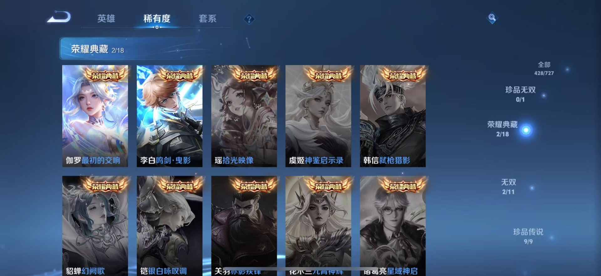 大乔白鹤梁神女,金蝉唐三藏,夏侯惇匿光决锋者,黄忠烈魂,铠青龙志,苏烈玄武志,干将莫邪冰霜恋舞曲,牛魔奔雷神使,项羽霸王别姬,后羿无尽星芒,吕布御风骁将,后羿如梦令,庄周玄嵩,诸葛亮时雨天司,公孙离祈雪灵祝,司空震愿照·山河定,裴擒虎梅西,鲁班大师匿光启智者,裴擒虎李小龙,裴擒虎天狼狩猎者,上官婉儿梁祝,上官婉儿天狼绘梦者,李白诗剑行,花木兰默契交锋,花木兰瑞麟志,马可波罗逐梦之星,马可波罗山海·玄木吟,桑启鸣野蒿,女娲愿照·千秋盛,孙悟空大圣娶亲,芈月白晶晶,百里玄策白虎志,马超神威,妲己愿照·众生和,韩信飞衡,韩信逐梦之影,百里守约朱雀志,蔡文姬奇迹圣诞,蔡文姬愿照·福禄聚,澜愿照·九州拓,虞姬愿照·岁时盈,关羽武圣,关羽冰锋战神