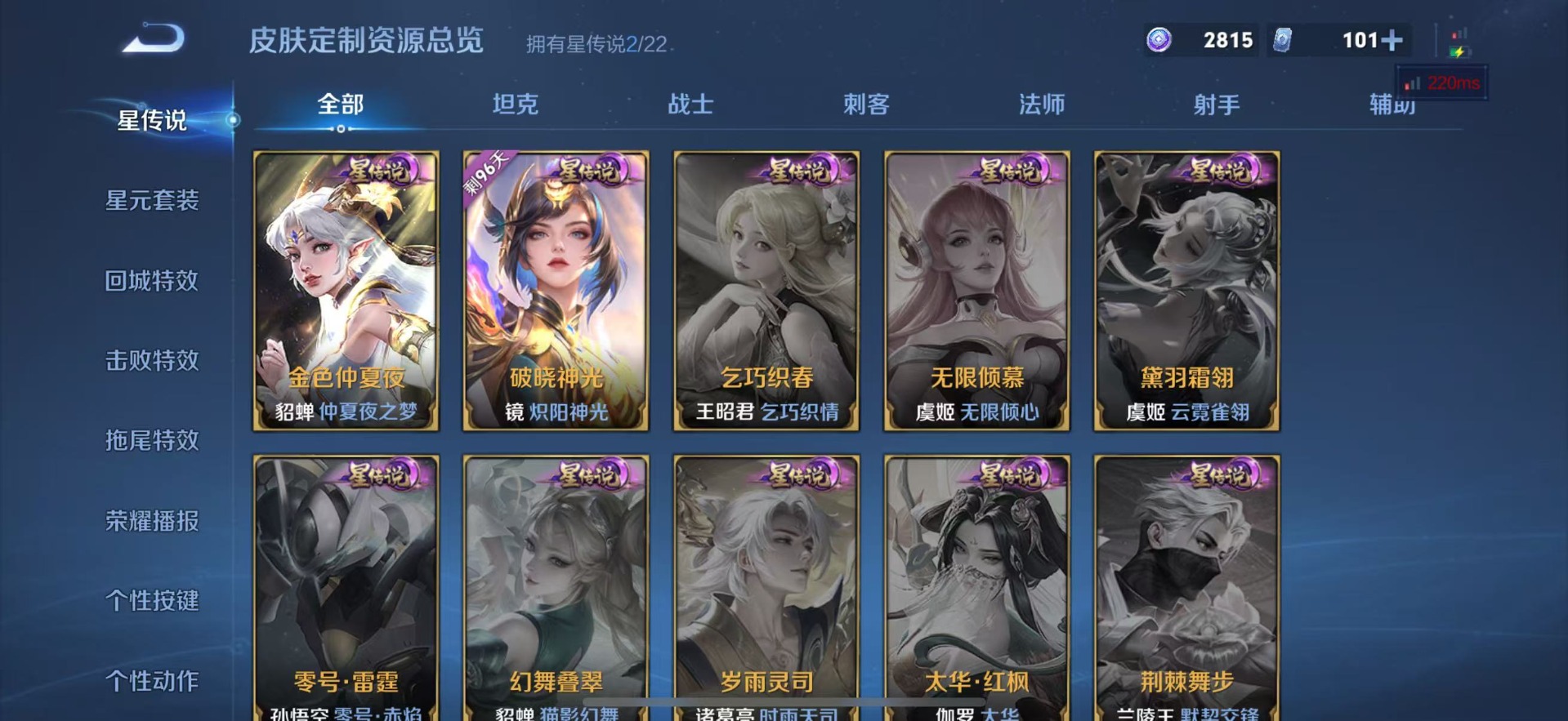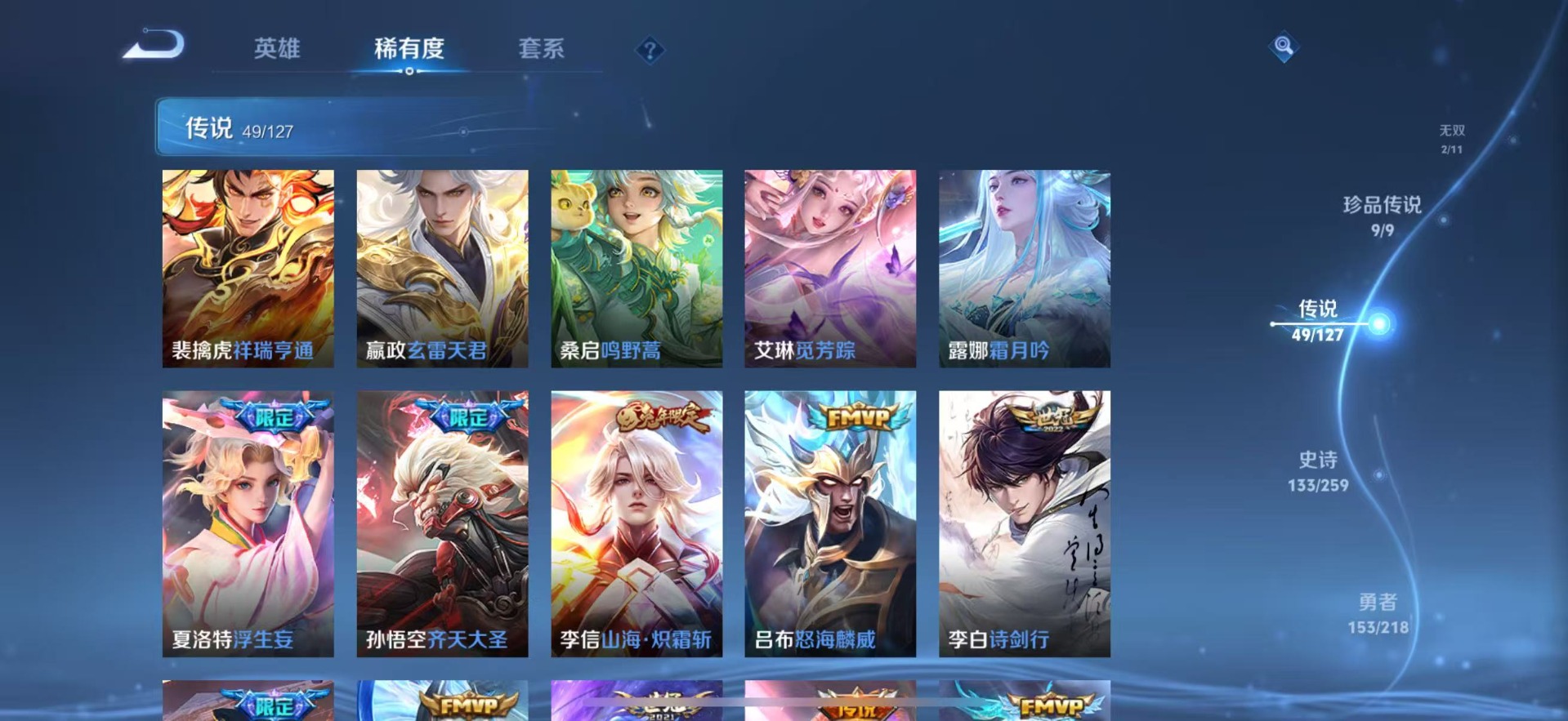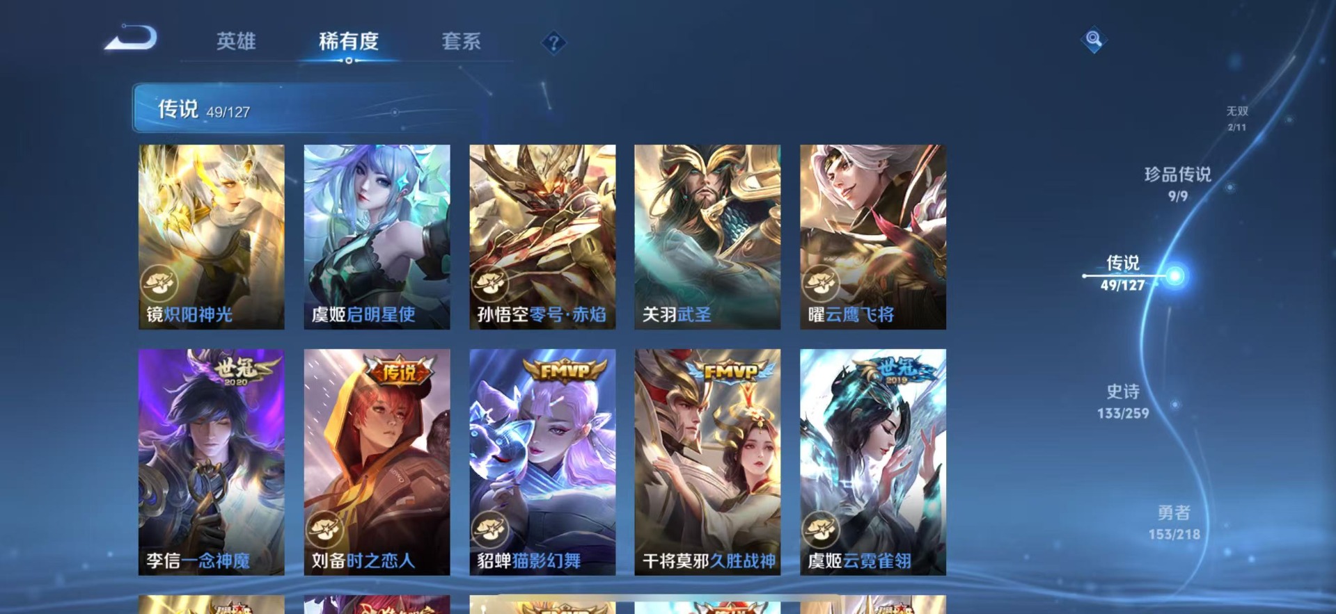 刘备时之恋人,赵云淬星耀世,干将莫邪久胜战神,李信一念神魔,达摩黄金狮子座,王昭君乞巧织情,露娜霜月吟,镜炽阳神光,周瑜音你心动,杨玉环星之鸣奏,裴擒虎祥瑞亨通,貂蝉猫影幻舞,夏洛特浮生妄,艾琳觅芳踪,西施游龙清影,嬴政玄雷天君,孙悟空零号·赤焰,曜云鹰飞将,曜李逍遥,马超无双飞将,李元芳飞鸢探春,虞姬云霓雀翎,云缨幻光神枪