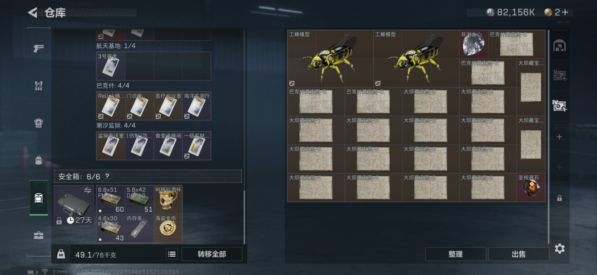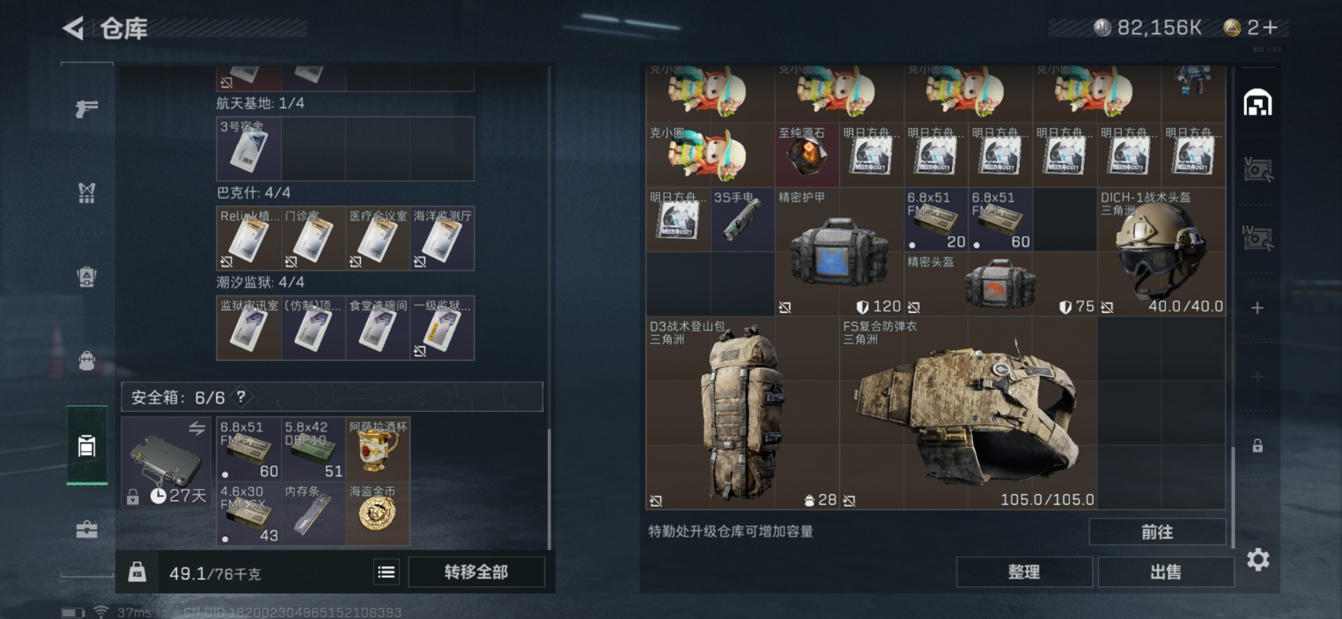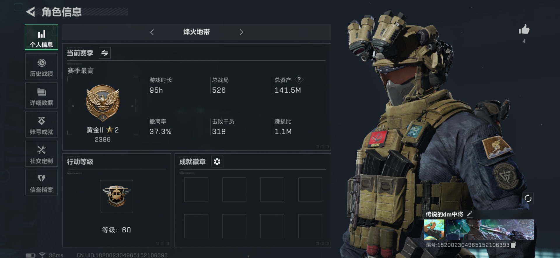 [11605593]总资产:141.5M 1干员外观 1近战传说 9传说枪械 哈夫币:82.156K 高级安全箱(2×3)9.15号到期 可二次 可修改实名 优质装备:近战-北极星 烽火地带段位:黄金 全面战场段位:无段位 传说武器皮肤:CAR-15突击步枪-阿米娅,QCQ171冲锋枪-北极星,AK-12突击步枪-特斯拉线圈,SR-3M紧凑突击步枪-特斯拉线圈,UZI冲锋枪-特斯拉线圈,勇士冲锋枪-能天使-午夜邮差,725双管霰弹枪-送葬人-无题密令,K437突击步枪-北极星 干员外观:露娜-黑·天际线
