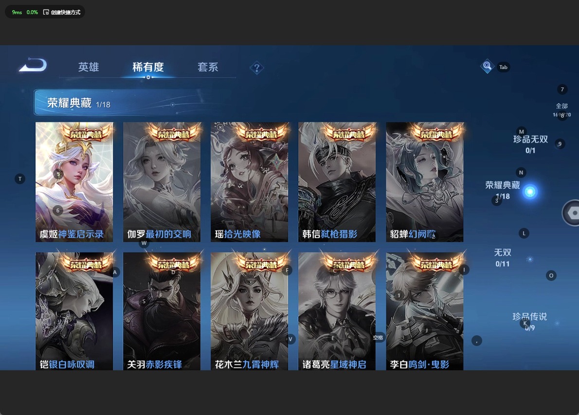 夏侯惇朔风刀,老夫子醍醐杖,沈梦溪大漠名商,盾山御銮,苏烈千军破阵,达摩沙漠行僧,兰陵王金庭之子,裴擒虎擒涛扼浪,鲁班大师探海日志,明世隐疑决卦,马可波罗暗影游猎,鬼谷子原初探秘者,张良古海寻踪,桑启海盐诗旅,狄仁杰万华元夜,程咬金演武夺筹,李元芳云中旅人,钟馗驱傩正仪
