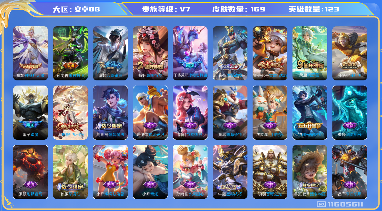 [11605611]V7 1典藏 5传说 123英雄 169皮肤 可修改实名 荣耀水晶:神鉴启示录 传说皮:末日机甲-孙尚香(绿蚂蚱),云霓雀翎 珍宝阁皮:万物之道,玩趣恶龙 限定皮:愿照·九州拓(澜年限),逐霄战戟,鸣野蒿,降魔,游园惊梦,孙行者,冰霜恋舞曲,寅虎·瑞焰(虎皮蛋子) 史诗皮:星界战将,茶境仙,灵蛊蚀心,龙之律动,百相守梦-百里守约,怒海争锋,蔬乡物语(鲁班七号),破空之剑,苍穹之光,特工魅影,千年之狐,永昼,高渐离燃音魔法,蒙恬荣光圣徽,青蛇,末日机甲-吕布,节奏热浪,女仆咖啡,摇滚巨星,水果甜心,绅士熊喵,天才门将,星夜王子,心灵骇客,功夫厨神,幽灵船长,鬼剑武藏,心灵战警,天秀·启明,地狱岩魂,缤纷独角兽,乘风破浪,月团寄思,水晶猎龙者,曙光守护者,金属风暴,原初追逐者,圣诞恋歌,鹰眼统帅,暗夜贵公子,黎明之约,奇遇舞章,无心