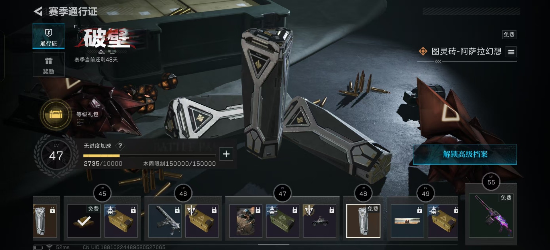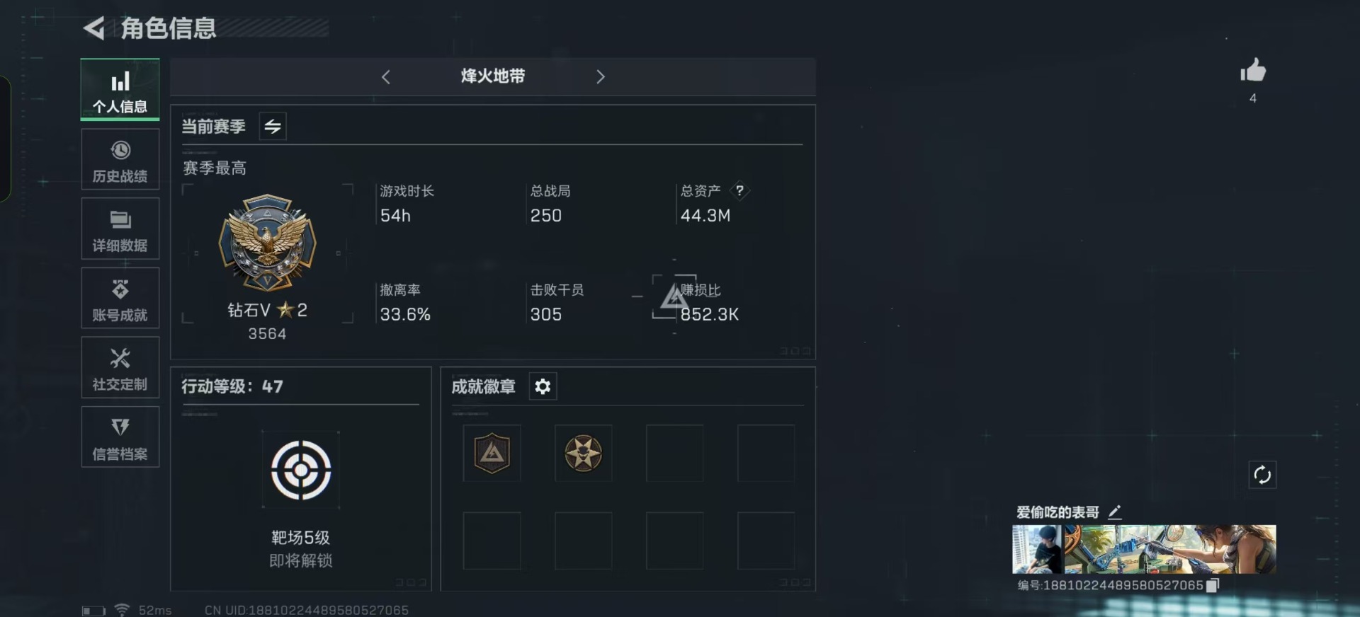 [11605616]可二次 可修改实名 实名:可修改 烽火地带段位:钻石 全面战场段位:上等兵 进阶安全箱(2×2)9.15号到期 总资产:44.3 哈夫币:14.366 传说武器皮肤:SCAR-H战斗步枪-水墨云图,复合弓-黑-天际线,CAR-15突击步枪-阿米娅 干员外观:骇爪-水墨云图