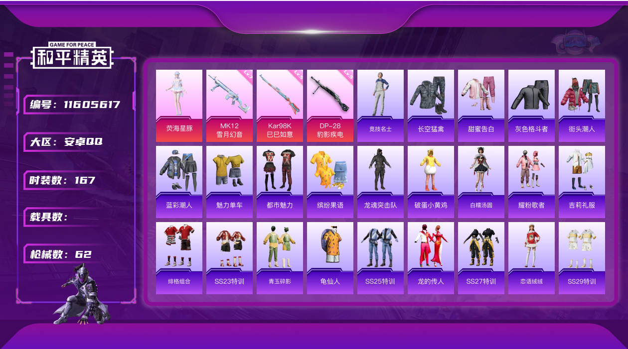 [11605617]1粉装 3特效枪 3印记 可二次 可修改实名 优质装备:MK12-雪月幻音,七级MK12-雪月幻音,荧海星豚,Kar98K-巳巳如意 稀有枪皮:DP-28-豹影疾电 五级特效枪:五级Kar98K-巳巳如意,五级DP-28-豹影疾电 紫色装扮:SS23特训,SS31特训套装,极速光影,SS30特训套装,云朵鹅,彩虹兔,雪绒豹,SS33特训套装,顶瓜瓜,灵公主,吉莉礼服,都市魅力,长空猛禽,缤纷果语,蓝彩潮人,街头潮人,绛羽幽主,魅力单车,龙的传人,龟仙人,龙魂突击队,破蛋小黄鸡,甜蜜告白,灰色格斗者,SS29特训,星途旅人,异域银装,巳巳如意,都市丽猫,青团波波,糖糖葫芦,竞技名士,绒宝小鹅,SS25特训,SS27特训,智谋强哥,大橘大利,小鸟芋圆,耀粉歌者,粉恋花,蓝冰羽,紫幽梦,SS32特训服(SS32特训套装),青玉碎影,绯格组合,白糯汤圆,恋语绒绒 优质战备:千金淑猫降落伞,无垠阁降落伞,飒粉甜心降落伞