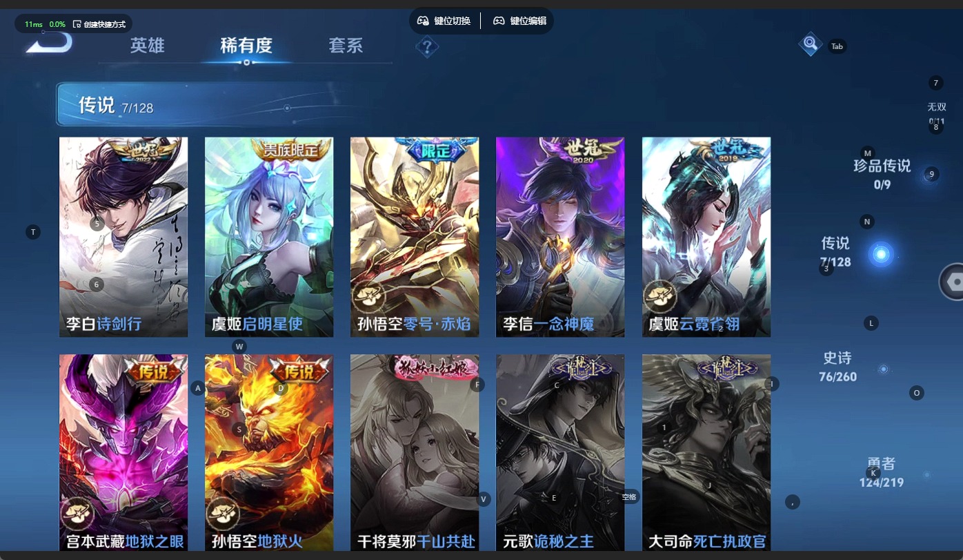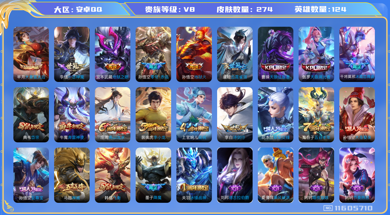 [11605710]V8 1典藏 7传说 124英雄 274皮肤 可修改实名 优质装备:大秦宣太后,一念神魔,云霓雀翎,地狱火,零号·赤焰,地狱之眼 珍宝阁皮:女武神,玩趣恶龙 限定皮:至尊宝,神威(电光马子),飞衡(韩信年限),高山流水,诗剑行,降魔,五谷丰年,冰锋战神,梁祝,岱宗(典韦年限),天狼溯光者,天狼征服者,奔雷神使(牛魔年限),李小龙,默契交锋-花木兰,大圣娶亲,冰霜恋舞曲 史诗皮:白龙吟,黄金分割率,特工魅影,千年之狐,永昼,魅语,百解令(蒙犽),青蛇,偶像歌手,暗夜猫娘,龙骑士(小龙虾),末日机甲-吕布,时之恋人-孙尚香,乱世虎臣,节奏热浪,女仆咖啡,摇滚巨星,水果甜心,天才门将,星夜王子,心灵骇客,功夫厨神,德古拉伯爵,暗隐猎兽者,幽灵船长,鬼剑武藏,地狱岩魂,纤云弄巧,繁星吟游(呼啦呼啦),拒霜思,缤纷独角兽,乘风破浪,逐浪之夏,水晶猎龙者,曙光守护者,金属风暴,圣诞狂欢,圣诞恋歌,鹰眼统帅,魅力维加斯,黎明之约,无心,未来纪元-赵云
