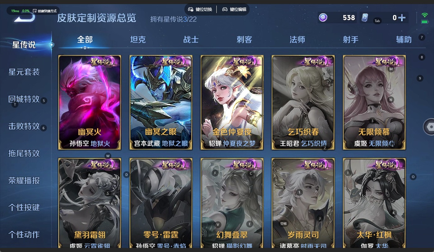 曹操天狼征服者,伽罗天狼溯光者,干将莫邪冰霜恋舞曲,典韦岱宗,牛魔奔雷神使,裴擒虎李小龙,上官婉儿梁祝,李白诗剑行,花木兰默契交锋,孙悟空大圣娶亲,孙悟空至尊宝,马超神威,韩信飞衡,墨子降魔,关羽冰锋战神