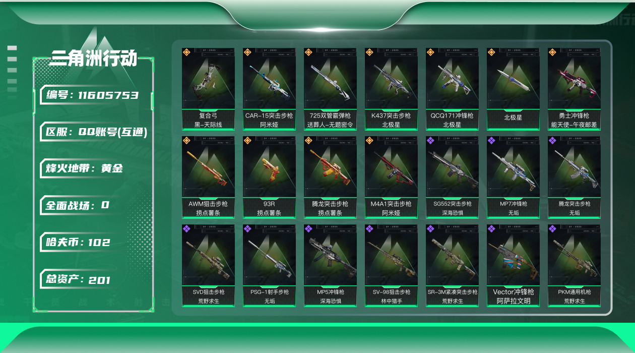 [11605753]总资产:201.1M 2干员外观 1近战传说 11传说枪械 哈夫币:102K 高级安全箱(2×3)9.15号到期 可二次 可修改实名 优质装备:近战-北极星 烽火地带段位:黄金 全面战场段位:上等兵 传说武器皮肤:AWM狙击步枪-捞点薯条,腾龙突击步枪-捞点薯条,93R-捞点薯条,勇士冲锋枪-能天使-午夜邮差,复合弓-黑-天际线,K437突击步枪-北极星,QCQ171冲锋枪-北极星,725双管霰弹枪-送葬人-无题密令,M4A1突击步枪-阿米娅,CAR-15突击步枪-阿米娅 史诗武器皮肤:MP5冲锋枪-深海恐惧,SG552突击步枪-深海恐惧,SV-98狙击步枪-林中猎手,PKM通用机枪-荒野求生,腾龙突击步枪-无垢,MP7冲锋枪-无垢,PSG-1射手步枪-无垢,SVD狙击步枪-荒野求生,SR-3M紧凑突击步枪-荒野求生,Vector冲锋枪-阿萨拉文明 干员外观:蜂医-送葬人·无题密令(S5),露娜-黑·天际线