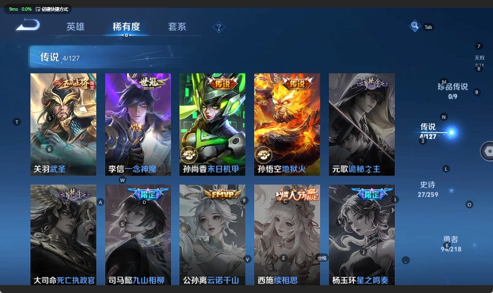 - [11824184]V9 2典藏 1无双 2珍品传说 18传说 126英雄 326皮肤 典藏英雄武则天 可修改实名 优质装备:无限飓风号(高达),神鉴启示录,天机白泽,朽木白哉,黑崎一护,黄金狮子座,黄金射手座,绛天战甲(鸡嘴战神),黄金白羊座,炽阳神光,一念神魔,云霓雀翎,末日机甲-孙尚香(绿蚂蚱),地狱火,地狱之眼 传说皮:落雪白狼,死亡执政官 珍宝阁皮:妄想食味,玩趣恶龙 限定皮:鸣野蒿,异界灵契(白毛香),瑞麟志(木兰年限),高山流水,五谷丰年,青龙志(铠年限),武圣,天狼运算者,梁祝,龙胆,烈魂,天狼溯光者,天狼绘梦者,李小龙,朱雀志(守约年限),辉光之辰,奇迹圣诞,孙行者,猪悟能,一生所爱,大圣娶亲,引擎之心,天魔缭乱,冰霜恋舞曲,乒乒小将,美猴王,寅虎·瑞焰(虎皮蛋子),时之祈愿-云中君,百木心枪,玉兔公主,时之奇旅-妲己 史诗皮:赞萌露比,鸭鸭历险记-刘禅,龙之律动,石田雨龙,百相守梦-周瑜,幻珠鲛人,琥珀纪元伽罗,守夜人,百相守梦-黄忠,苍穹之光,电玩小子(小书包),白龙吟,特工魅影,千年之狐,永昼,电玩·爆裂旋风,江河有灵,百解令(蒙犽),高渐离燃音魔法,偶像歌手,龙骑士(小龙虾),暗夜猫娘,魅语,无限星赏官,晚萤,冰冠公主,青蛇,时之恋人-孙尚香,乱世虎臣,节奏热浪,修罗,女仆咖啡,摇滚巨星,水果甜心,天才门将,星夜王子,心灵骇客,时之奇旅-安琪拉,功夫厨神,德古拉伯爵,幽灵船长,鬼剑武藏,心灵战警,舞动绿茵,地狱岩魂,纤云弄巧,繁星吟游(呼啦呼啦),缤纷独角兽,乘风破浪,逐浪之夏,水晶猎龙者,曙光守护者,箭羽风息,金属风暴,鹰眼统帅,暗夜贵公子,魅力维加斯,未来纪元-赵云
