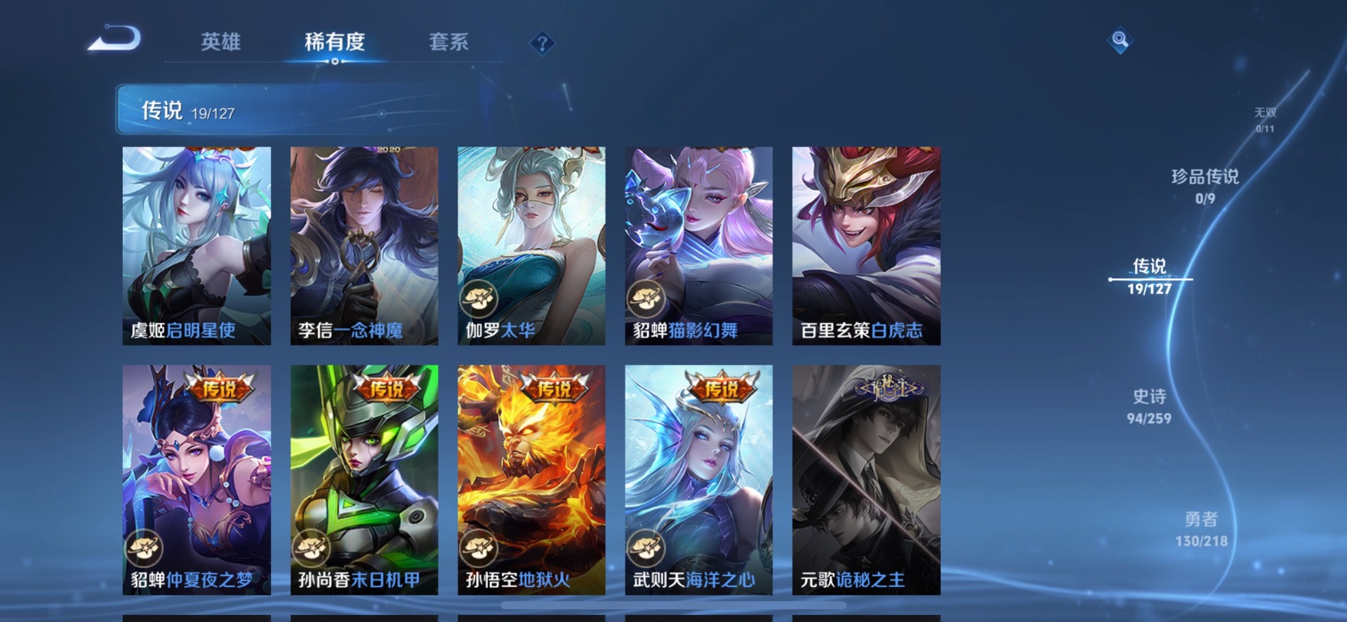 刘邦夺宝奇兵,夏侯惇朔风刀,老夫子醍醐杖,沈梦溪星空之诺,沈梦溪大漠名商,盾山御銮,曹操烛龙,孙膑妖精王,苏烈千军破阵,典韦穷奇,典韦蓝屏警告,达摩沙漠行僧,牛魔御旌,吕布猎兽之王,庄周蜃楼王,元歌云间偶戏,兰陵王金庭之子,鲁班大师探海日志,明世隐疑决卦,蒙犽狂想玩偶喵,马可波罗暗影游猎,白起狰,鬼谷子原初探秘者,张良古海寻踪,女娲朔望之晖,桑启海盐诗旅,狄仁杰万华元夜,嬴政白昼王子,芈月重明,程咬金演武夺筹,扁鹊炼金王,李元芳银河之约,李元芳云中旅人,弈星混沌棋,虞姬凯尔特女王,米莱狄御霄,钟馗驱傩正仪,狂铁御狮,太乙真人饕餮
