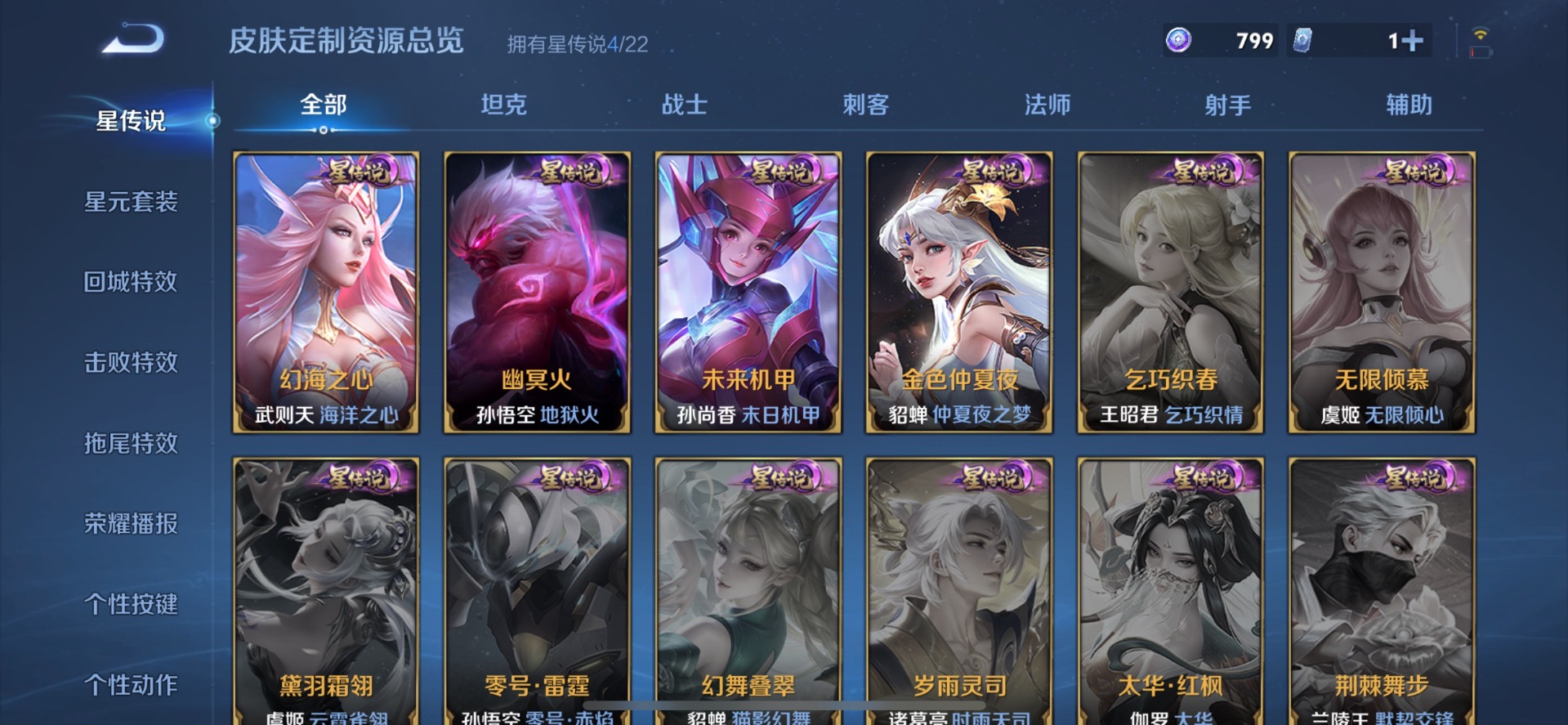 金蝉唐三藏,伽罗太华,赵云龙胆,干将莫邪冰霜恋舞曲,孙尚香异界灵契,牛魔奔雷神使,后羿如梦令,露娜启示之音,露娜一生所爱,公孙离祈雪灵祝,裴擒虎李小龙,裴擒虎寅虎·赤拳,东皇太一逐梦之光,上官婉儿梁祝,上官婉儿天狼绘梦者,花木兰瑞麟志,花木兰青春决赛季,桑启鸣野蒿,猪八戒猪悟能,孙悟空大圣娶亲,孙悟空至尊宝,百里玄策白虎志,马超神威,赵云引擎之心,韩信傲雪梅枪,蔡文姬奇迹圣诞,瑶时之祈愿,妲己热情桑巴,嫦娥如梦令,关羽冰锋战神