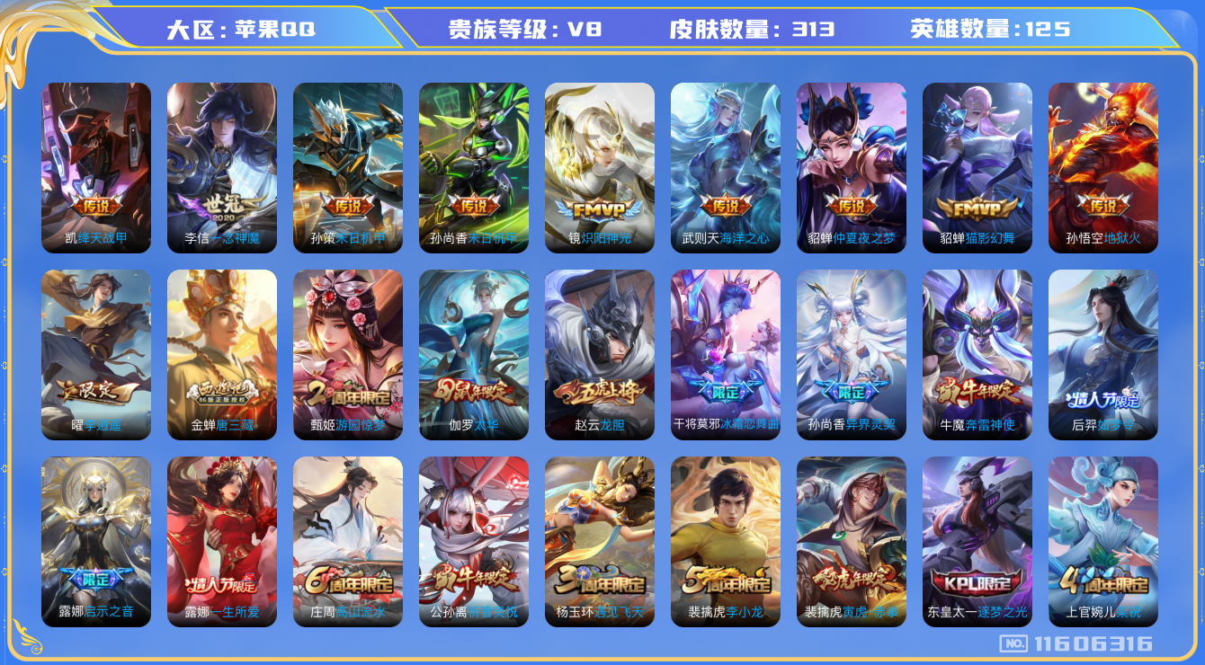 - [12163873]V7 1典藏 6传说 123英雄 332皮肤 可修改实名 优质装备:天鹅之梦(小乔典藏),游龙清影(小青龙),山海·琳琅生(小乔年限) 珍宝阁皮:妄想食味,蔷薇恋人,玩趣恶龙 限定皮:愿照·众生和(妲己年限),逐霄战戟,鸣野蒿,武陵仙君(小桃花),傲雪梅枪,白鹤梁神女,魔法小厨娘,飞衡(韩信年限),玄嵩(庄周年限),遇见飞天,高山流水,五谷丰年,幽恒(沐浴露),游园惊梦,逐梦之音,李小龙,逐梦之影,纯白花嫁,青春决赛季,蜜橘之夏,热情桑巴,美猴王,寅虎·瑞焰(虎皮蛋子),寅虎·心曲(虎婆),唐三藏,时之奇旅-妲己 史诗皮:鸭鸭历险记-刘禅,器灵·浮梦炉,化蝶舞,破空之剑,蒙犽顽岩魄,芈月浮光幕影,蔬乡物语(鲁班七号),乘龙·聚宝船(安琪拉年限),琥珀纪元伽罗,百相守梦-百里守约,百相守梦-黄忠,紫霞仙子,苍穹之光,黄金分割率,千年之狐,电玩·爆裂旋风,江河有灵,雪夜绮愿(周瑜),百解令(蒙犽),高渐离燃音魔法,偶像歌手,龙骑士(小龙虾),白蛇,无限星赏官,冰冠公主,末日机甲-吕布,猫狗日记-孙策,乱世虎臣,节奏热浪,女仆咖啡,水果甜心,天才门将,星夜王子,心灵骇客,时之奇旅-安琪拉,功夫厨神,德古拉伯爵,暗隐猎兽者,幽灵船长,鬼剑武藏,心灵战警,舞动绿茵,地狱岩魂,纤云弄巧,拒霜思,缤纷独角兽,乘风破浪,逐浪之夏,水晶猎龙者,唤灵魅影,金属风暴,圣诞狂欢,圣诞恋歌,鹰眼统帅,暗夜贵公子,魅力维加斯,无心,未来纪元-赵云