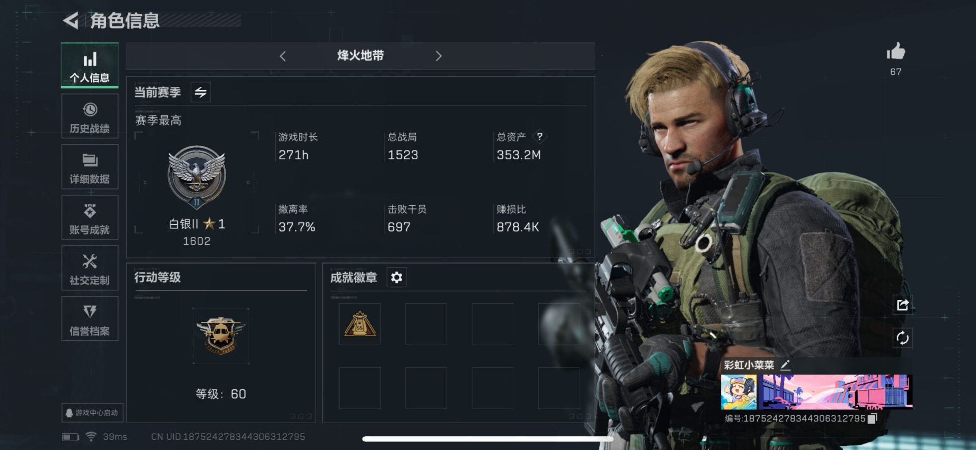 - [11523891]可二次 可修改实名 实名:可修改 烽火地带段位:白银 全面战场段位:列兵 高级安全箱(2×3)9.15号到期 总资产:53.6 哈夫币:13.518 传说武器皮肤:SCAR-H战斗步枪-水墨云图,AK-12突击步枪-夜鹰,复合弓-黑-天际线,725双管霰弹枪-送葬人-无题密令,M4A1突击步枪-蚀金玫瑰,CAR-15突击步枪-黑鹰坠落 干员外观:红狼-蚀金玫瑰,骇爪-水墨云图,无名-夜鹰,露娜-黑·天际线