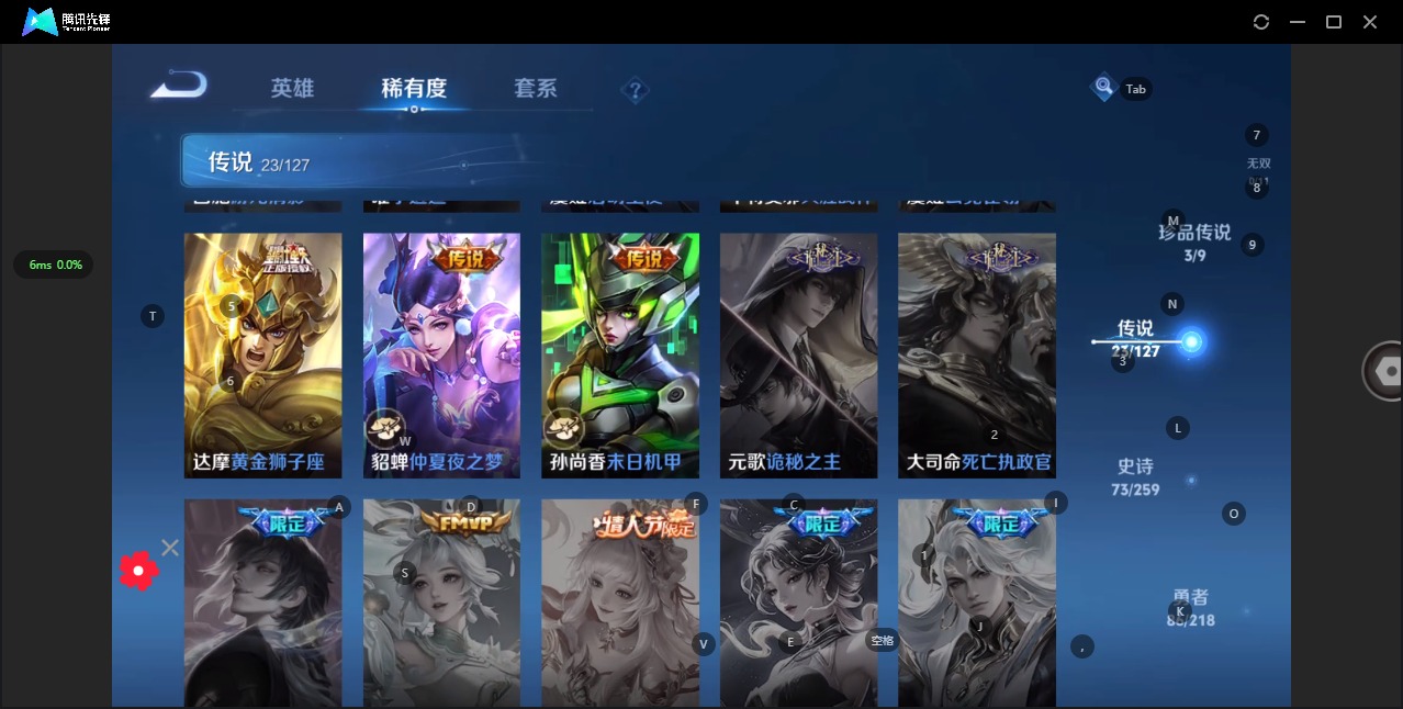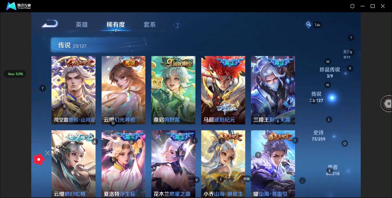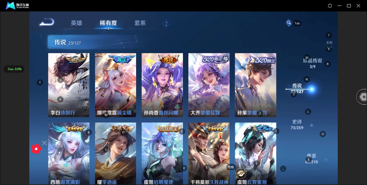 - [12031992]V7 6传说 124英雄 214皮肤 可修改实名 优质装备:零号·赤焰,燃星之曲 传说皮:幻光神枪 珍宝阁皮:妄想食味,优雅恋人,蔷薇恋人 限定皮:鸣野蒿,至尊宝,异界灵契(白毛香),傲雪梅枪,飞衡(韩信年限),高山流水,怒海麟威,五谷丰年,游园惊梦,逐梦之星,天狼溯光者,李小龙,逐梦之影,孙行者,一生所爱,青春决赛季,匿光追影者,女儿国国王,百木心枪 史诗皮:电玩小子(小书包),白龙吟,特工魅影,千年之狐,永昼,百解令(蒙犽),蒙恬荣光圣徽,冰冠公主,末日机甲-吕布,猫狗日记-孙策,时之恋人-孙尚香,女仆咖啡,水果甜心,绅士熊喵,天才门将,星夜王子,时之奇旅-安琪拉,功夫厨神,暗隐猎兽者,幽灵船长,鬼剑武藏,心灵战警,纤云弄巧,繁星吟游(呼啦呼啦),拒霜思,缤纷独角兽,乘风破浪,逐浪之夏,水晶猎龙者,曙光守护者,金属风暴,圣诞狂欢,圣诞恋歌,鹰眼统帅,魅力维加斯,赏金猎手,未来纪元-赵云