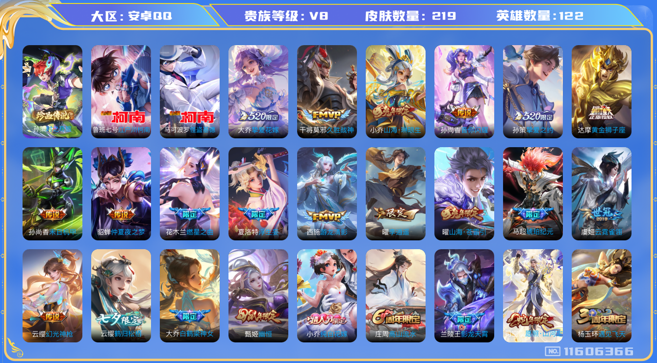 - [12092182]V7 1典藏 5传说 125英雄 232皮肤 可修改实名 优质装备:鸣剑·曳影,久胜战神,末日机甲-孙尚香(绿蚂蚱),涂山容容 传说皮:幻光神枪 珍宝阁皮:胡桃夹子,优雅恋人 限定皮:至尊宝,凤求凰(白切鸡),高山流水,诗剑行,游园惊梦,梁祝,天狼绘梦者,李小龙,孙行者,猪悟能 史诗皮:化蝶舞,茶境仙,怒海争锋,东方月初,琥珀纪元伽罗,决胜骁骑,蔬乡物语(鲁班七号),百相守梦-黄忠,紫霞仙子,电玩小子(小书包),黄金分割率,特工魅影,千年之狐,江河有灵,高渐离燃音魔法,冰冠公主,偶像歌手,暗夜猫娘,猫狗日记-孙策,时之恋人-孙尚香,乱世虎臣,节奏热浪,修罗,女仆咖啡,水果甜心,绅士熊喵,星夜王子,时之奇旅-安琪拉,德古拉伯爵,暗隐猎兽者,幽灵船长,鬼剑武藏,舞动绿茵,纤云弄巧,拒霜思,逐浪之夏,金属风暴,原初追逐者,圣诞狂欢,圣诞恋歌,鹰眼统帅,魅力维加斯,黎明之约