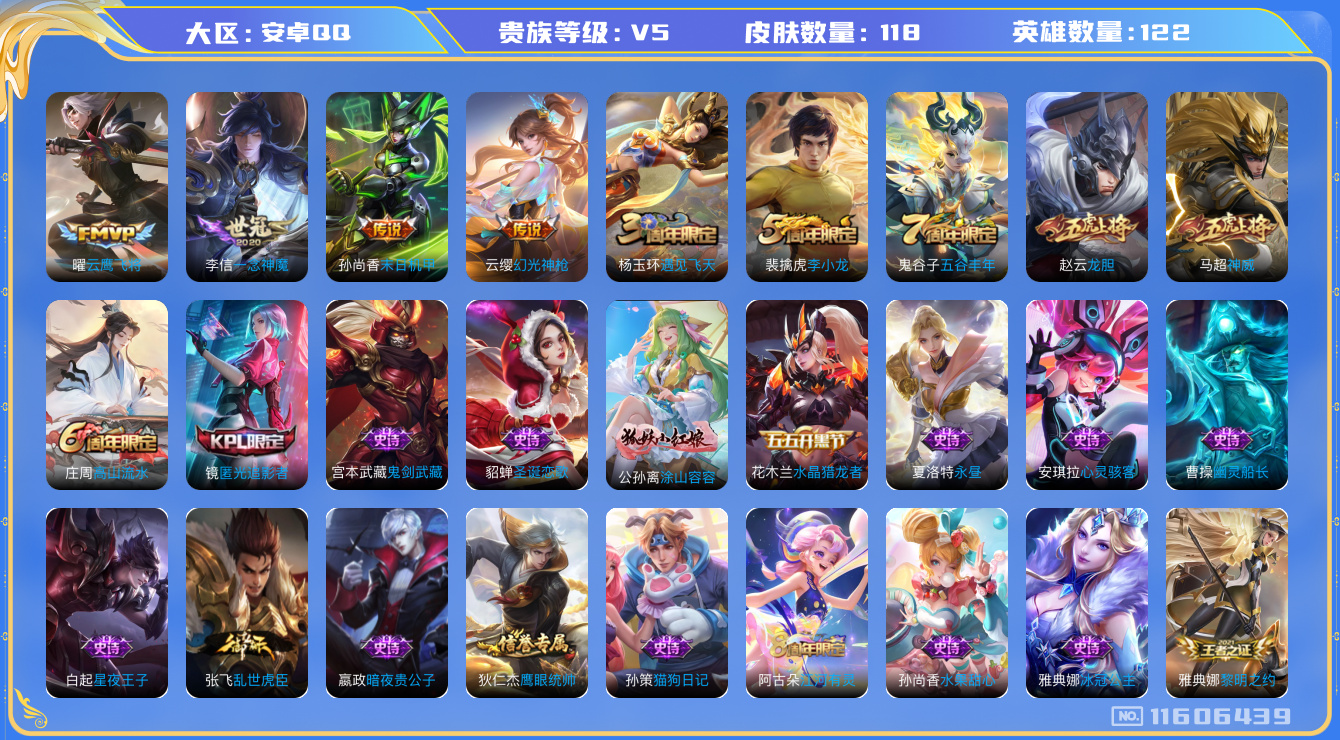 [11606439]V5 4传说 122英雄 118皮肤 可修改实名 优质装备:云鹰飞将(小将军),一念神魔,末日机甲-孙尚香(绿蚂蚱),涂山容容 传说皮:幻光神枪 珍宝阁皮:妄想食味,玩趣恶龙 限定皮:神威(电光马子),遇见飞天,高山流水,五谷丰年,龙胆,李小龙,匿光追影者 史诗皮:永昼,江河有灵,冰冠公主,猫狗日记-孙策,乱世虎臣,修罗,水果甜心,星夜王子,心灵骇客,幽灵船长,鬼剑武藏,水晶猎龙者,金属风暴,圣诞狂欢,圣诞恋歌,鹰眼统帅,暗夜贵公子,黎明之约,无心