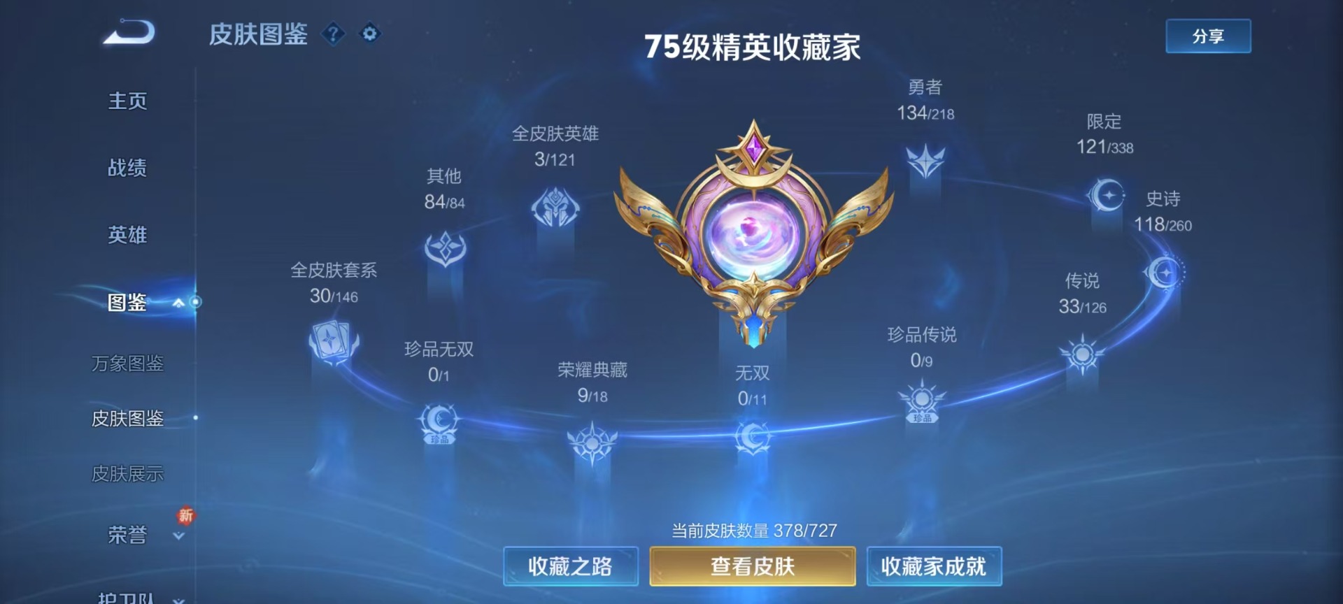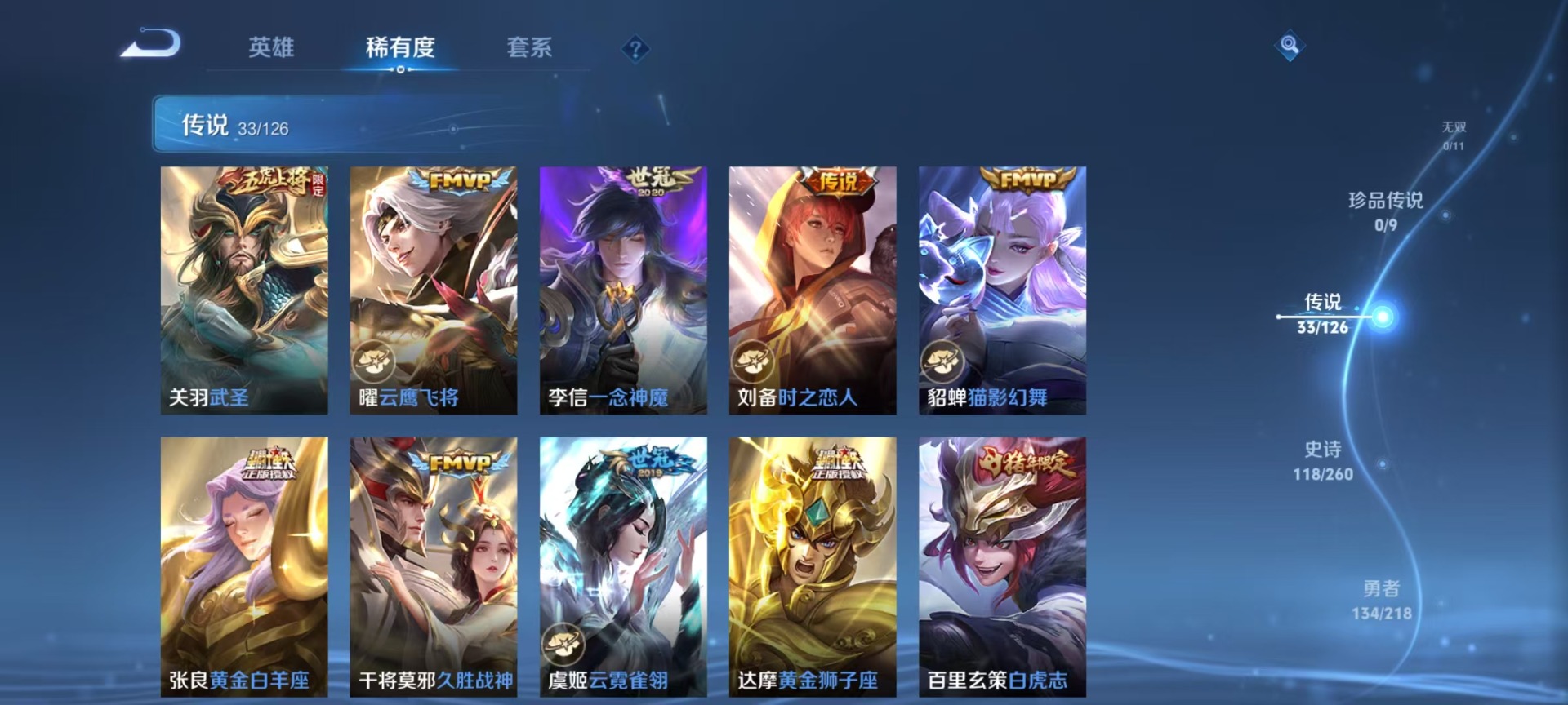 - PX_2082833-贵族等级: V7 英雄数: 124 皮肤数: 188 传说皮: 黄金狮子座,地狱火,零号·赤焰 限定皮: 遇见飞天,李小龙,梁祝,神威,飞衡,天狼狩猎者,凤求凰,白虎志,青龙志,至尊宝,武陵仙君,傲雪梅枪,鸣野蒿