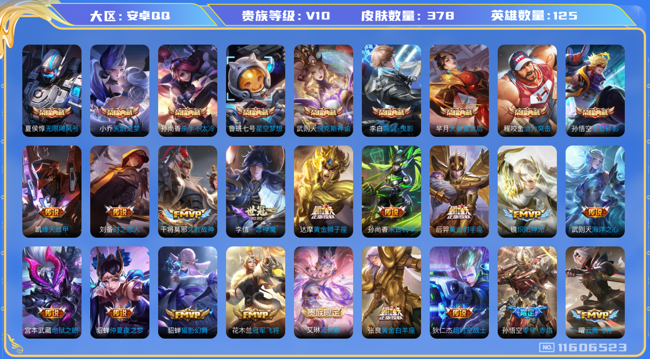 - [11548895]V10 2典藏 1珍品传说 23传说 126英雄 416皮肤 典藏英雄武则天 阿轲小国标 梦奇小国标 可修改实名 优质装备:赤影疾锋,弑枪猎影(韩信典藏),朽木白哉,绛天战甲(鸡嘴战神),炽阳神光,地狱火,仲夏夜之梦(大飞蛾),零号·赤焰,海洋之心,地狱之眼,胖达荣荣,时之恋人-刘备(电焊工),超时空战士-狄仁杰,挚爱之约,无双飞将,燃星之曲,鹤归松栖(云缨),霜月吟,艾琳觅芳踪,涂山容容 传说皮:九山相柳 珍宝阁皮:万物之道,优雅恋人 限定皮:愿照·九州拓(澜年限),鸣野蒿,至尊宝,白虎志(电光耗子),凤求凰(白切鸡),凤凰于飞,傲雪梅枪,白晶晶,飞衡(韩信年限),玄嵩(庄周年限),遇见飞天,高山流水,五谷丰年,冰锋战神,游园惊梦,梁祝,逐梦之星,烈魂,岱宗(典韦年限),李小龙,逐梦之光,如梦令-嫦娥,如梦令-后羿,霸王别姬-虞姬,奇迹圣诞,纯白花嫁,孙行者,大圣娶亲,引擎之心,冰霜恋舞曲,热情桑巴,美猴王,寅虎·赤拳(老虎年限),百木心枪,玉兔公主,山海·玄木吟(马可年限) 史诗皮:化蝶舞,灵蛊蚀心,星界战将,龙之律动,石田雨龙,百相守梦-周瑜,东方月初,超元猎域,百相守梦-黄忠,守夜人,紫霞仙子,电玩小子(小书包),白龙吟,黄金分割率,特工魅影,千年之狐,江河有灵,鹤归松栖(赵怀真),真我赫兹(镜),魅语,百解令(蒙犽),高渐离燃音魔法,蒙恬荣光圣徽,无限星赏官,冰冠公主,偶像歌手,白蛇,晚萤,电玩·爆裂旋风,暗夜猫娘,龙骑士(小龙虾),末日机甲-吕布,猫狗日记-孙策,猫狗日记-大乔,时之恋人-孙尚香,乱世虎臣,节奏热浪,修罗,女仆咖啡,摇滚巨星,水果甜心,绅士熊喵,天才门将,星夜王子,心灵骇客,时之奇旅-安琪拉,功夫厨神,德古拉伯爵,暗隐猎兽者,幽灵船长,鬼剑武藏,暗渊魔法,心灵战警,乐园奇幻夜,天秀·启明,舞动绿茵,地狱岩魂,诗语江南,纤云弄巧,拒霜思,缤纷独角兽,乘风破浪,逐浪之夏,月团寄思,水晶猎龙者,曙光守护者,热力回旋,箭羽风息,金属风暴,原初追逐者,圣诞狂欢,圣诞恋歌,鹰眼统帅,王者之锤,暗夜贵公子,魅力维加斯,黎明之约,雪上飞焰,千筹问战,无心,未来纪元-赵云