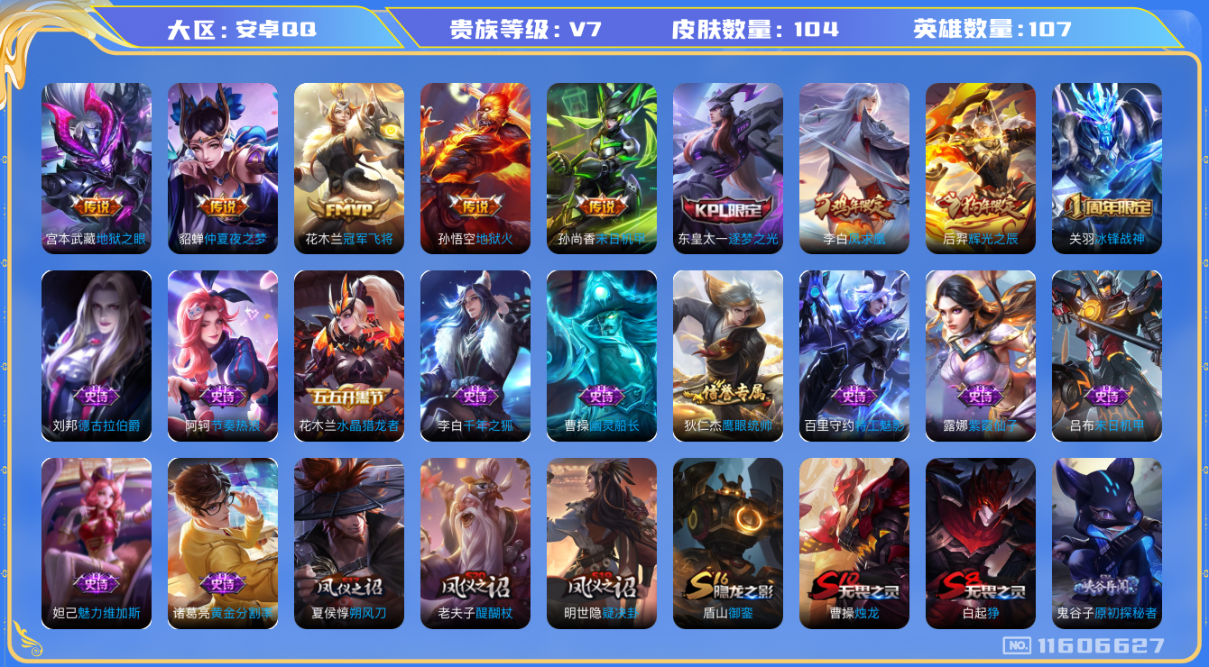 - PX_2085794-安卓Q 【可二次】 英雄数量:117 皮肤数量:87 贵族等级:贵族V4 传说品质1 史诗品质15至尊宝 鸣野蒿 鬼剑武藏 魅力维加斯 乱世虎臣 乘风破浪 未来纪元赵云 金属风暴 舞动绿茵 圣诞恋歌 千年之狐 女仆咖啡 冰冠公主 遇见飞天 鹰眼护卫 星夜王子 幻想奇妙夜 坚韧之力 守护之力 海滩派对 蔚蓝守将 千军破阵 驱傩正仪 演武夺筹 万华元夜 归虚梦演曜 归虚梦演蒙犽
