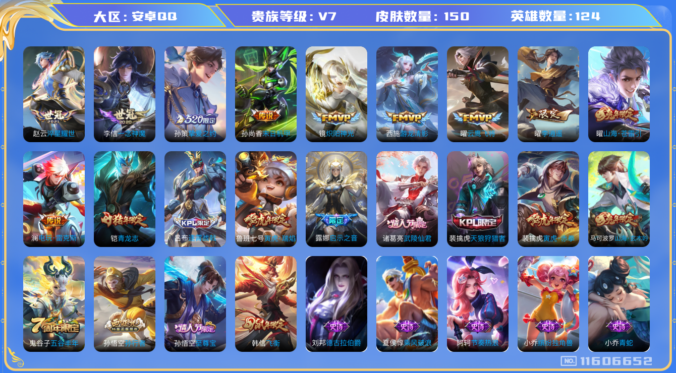 [11606652]V7 14传说 124英雄 150皮肤 可修改实名 优质装备:云鹰飞将(小将军),炽阳神光,一念神魔,末日机甲-孙尚香(绿蚂蚱),李逍遥,游龙清影(小青龙),淬星耀世,挚爱之约,山海·苍雷引(电光曜子),电玩·雷克斯 珍宝阁皮:玩趣恶龙 限定皮:逐霄战戟,至尊宝,武陵仙君(小桃花),飞衡(韩信年限),五谷丰年,青龙志(铠年限),天狼狩猎者,孙行者,寅虎·瑞焰(虎皮蛋子),寅虎·赤拳(老虎年限),启示之音,山海·玄木吟(马可年限) 史诗皮:特工魅影,百解令(蒙犽),青蛇,晚萤,猫狗日记-孙策,节奏热浪,修罗,摇滚巨星,水果甜心,天才门将,时之奇旅-安琪拉,功夫厨神,德古拉伯爵,暗隐猎兽者,鬼剑武藏,舞动绿茵,纤云弄巧,拒霜思,缤纷独角兽,乘风破浪,水晶猎龙者,热力回旋,金属风暴,鹰眼统帅,千筹问战,无心