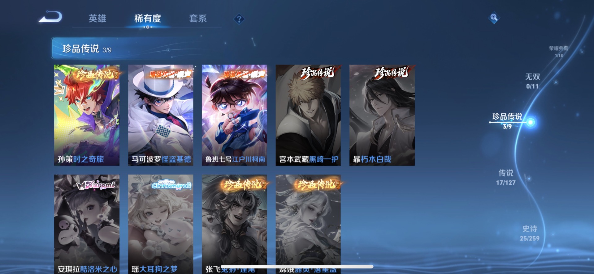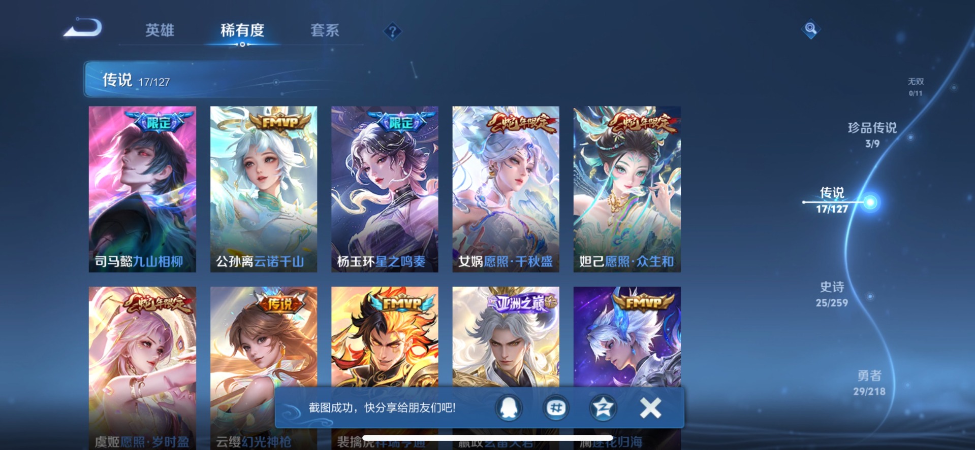 - PX_2083205-41 安卓QQ/非凡王者/290皮肤/125英雄/0典藏/0珍品无双/1无双/4珍品传说/24传说/83史诗/9稀有英雄 【4 珍品传说】黑崎一护 宫本武藏,怪盗基德 马可波罗,时之奇旅 孙策,器灵·落星盏 嫦娥, 【1 无双皮肤】器灵·螭龙剑 曜, 【24 传说皮肤】胖达荣荣 梦奇,武圣 关羽,启明星使 虞姬,无双飞将 马超,云鹰飞将 曜,齐天大圣 孙悟空,记忆之芯 公孙离