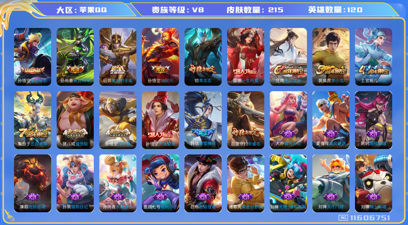 [11606751]V8 1典藏 4传说 120英雄 215皮肤 可修改实名 优质装备:全息碎影(猴子典藏),黄金射手座,末日机甲-孙尚香(绿蚂蚱),地狱火 珍宝阁皮:优雅恋人,女武神 限定皮:傲雪梅枪,高山流水,五谷丰年,青龙志(铠年限),梁祝,李小龙,朱雀志(守约年限),孙行者,猪悟能,一生所爱,大圣娶亲 史诗皮:电玩小子(小书包),黄金分割率,冰冠公主,偶像歌手,电玩·爆裂旋风,暗夜猫娘,猫狗日记-孙策,猫狗日记-大乔,摇滚巨星,水果甜心,绅士熊喵,天才门将,星夜王子,心灵骇客,功夫厨神,暗隐猎兽者,地狱岩魂,繁星吟游(呼啦呼啦),乘风破浪,逐浪之夏,热力回旋,金属风暴,圣诞狂欢,圣诞恋歌,鹰眼统帅,魅力维加斯