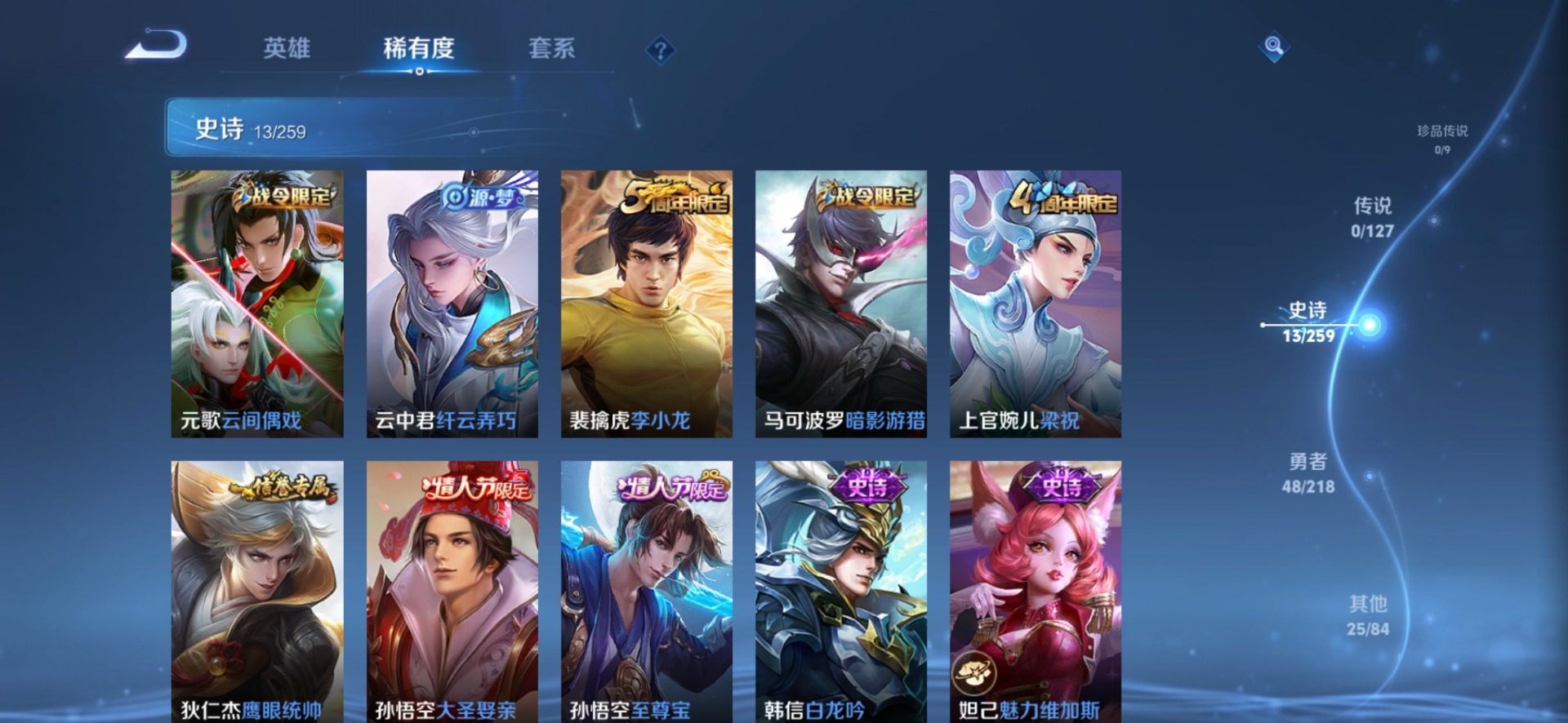 - PX_2074871-66 安卓QQ/永恒钻石/71皮肤/118英雄/0典藏/0珍品无双/0无双/0珍品传说/5传说/14史诗/4稀有英雄 【5 传说皮肤】燃星之曲 花木兰,冠军飞将 花木兰,幻光神枪 云缨,愿照·山河定 司空震,愿照·千秋盛 女娲, 【14 史诗皮肤】末日机甲 吕布,鬼剑武藏 宫本武藏,魅力维加斯 妲己,偶像歌手 王昭君,女仆咖啡 妲己,鹰眼统帅 狄仁杰,猫狗日记 孙策,龙之律动