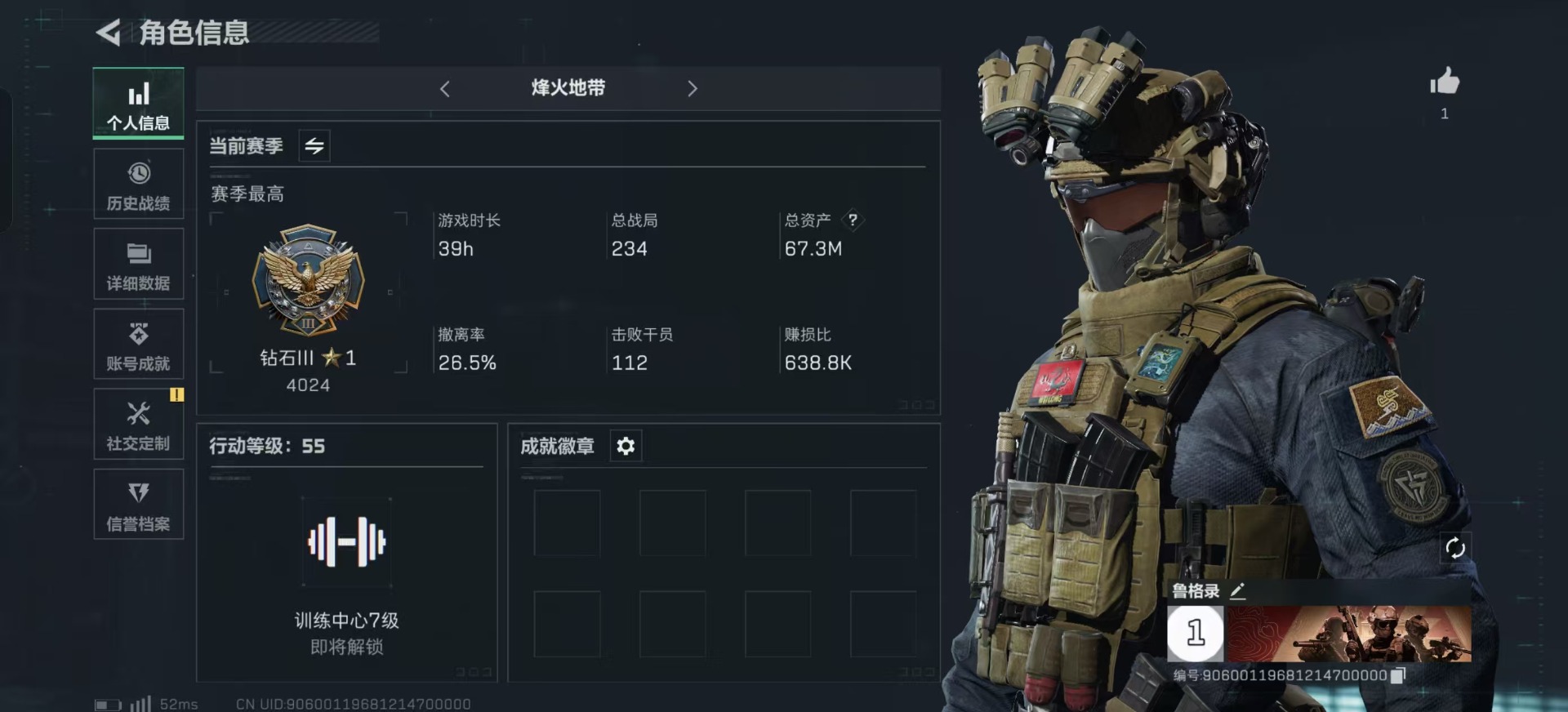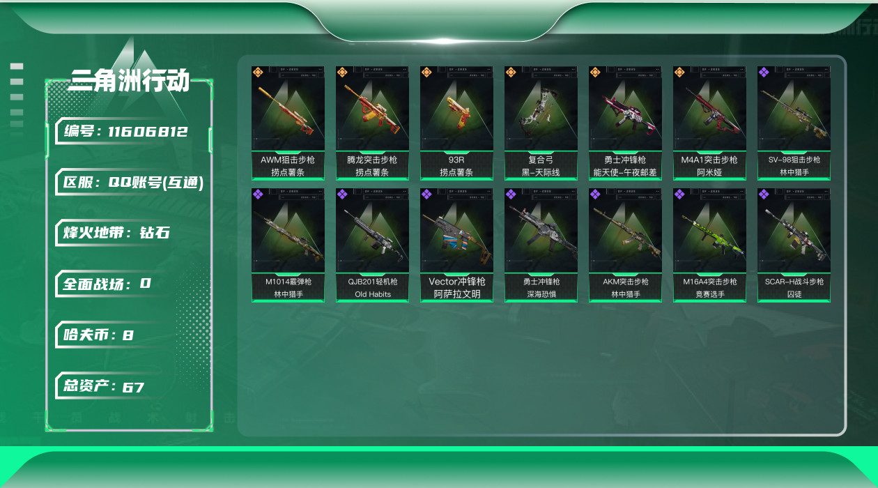 [11606812]总资产:67.3M 6传说枪械 哈夫币:8.201K 进阶安全箱(2×2)9.15号到期 可二次 可修改实名 烽火地带段位:钻石 全面战场段位:无段位 传说武器皮肤:AWM狙击步枪-捞点薯条,腾龙突击步枪-捞点薯条,93R-捞点薯条,勇士冲锋枪-能天使-午夜邮差,复合弓-黑-天际线,M4A1突击步枪-阿米娅 史诗武器皮肤:QJB201轻机枪-Old Habits,M1014霰弹枪-林中猎手,勇士冲锋枪-深海恐惧,AKM突击步枪-林中猎手,M16A4突击步枪-竞赛选手,SV-98狙击步枪-林中猎手,SCAR-H战斗步枪-囚徒,Vector冲锋枪-阿萨拉文明