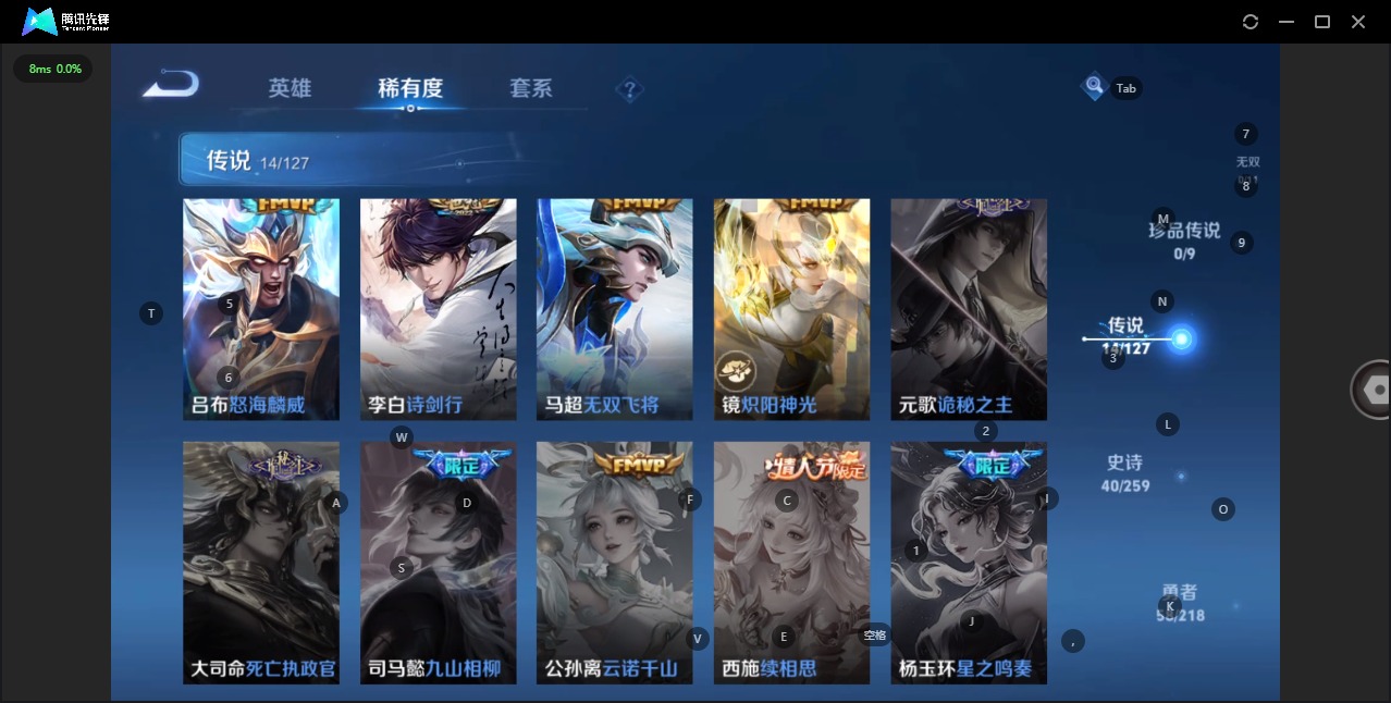 - [12090660]V6 3传说 92英雄 93皮肤 可修改实名 优质装备:一念神魔,澜逐花归海,涂山容容 传说皮:死亡执政官 限定皮:逐霄战戟 史诗皮:鸭鸭历险记-刘禅,糖绘人间,化蝶舞,谪仙醉月,龙之律动,百相守梦-周瑜,百相守梦-黄忠,苍穹之光,特工魅影,末日机甲-莱西奥,猫狗日记-孙策,摇滚巨星,水果甜心,鬼剑武藏,地狱岩魂,乘风破浪,箭羽风息,圣诞狂欢,鹰眼统帅,魅力维加斯,赏金猎手