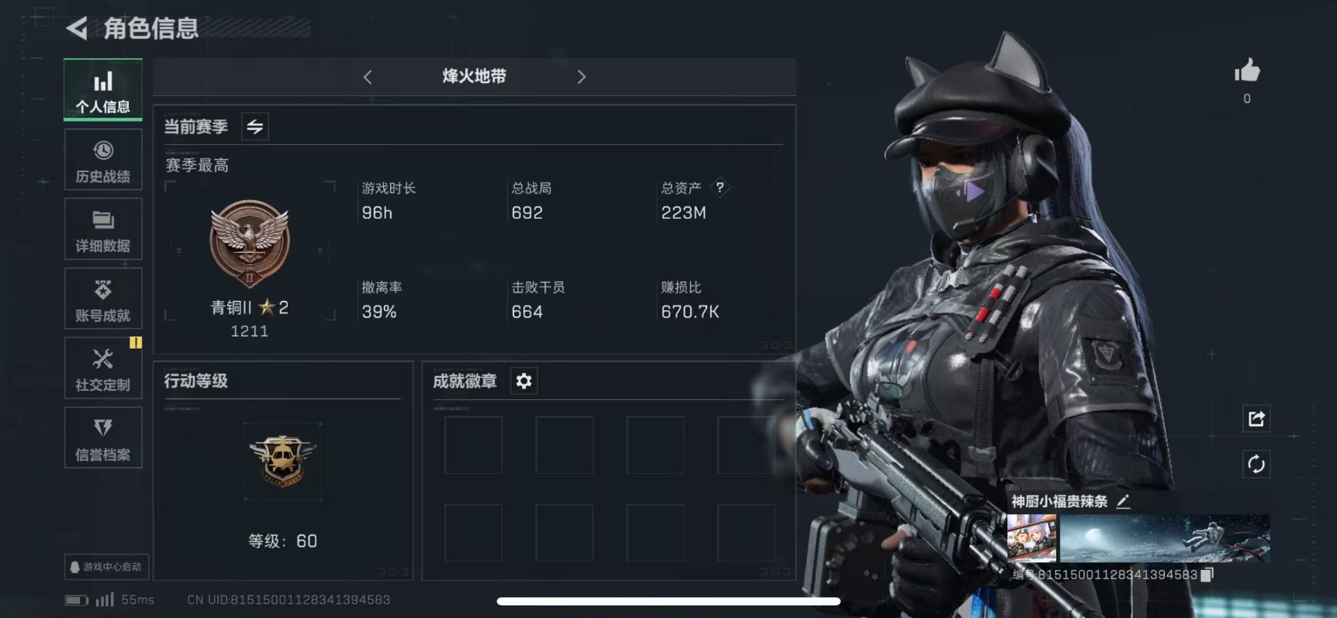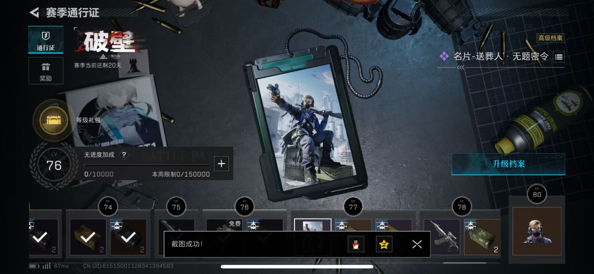 [11607031]总资产:223M 1干员外观 8传说枪械 哈夫币:142K 高级安全箱(2×3)9.15号到期 可二次 可修改实名 烽火地带段位:青铜 全面战场段位:无段位 传说武器皮肤:M4A1突击步枪-阿米娅,CAR-15突击步枪-阿米娅,复合弓-黑-天际线,AK-12突击步枪-特斯拉线圈,SR-3M紧凑突击步枪-特斯拉线圈,UZI冲锋枪-特斯拉线圈,勇士冲锋枪-能天使-午夜邮差,725双管霰弹枪-送葬人-无题密令 干员外观:露娜-黑·天际线