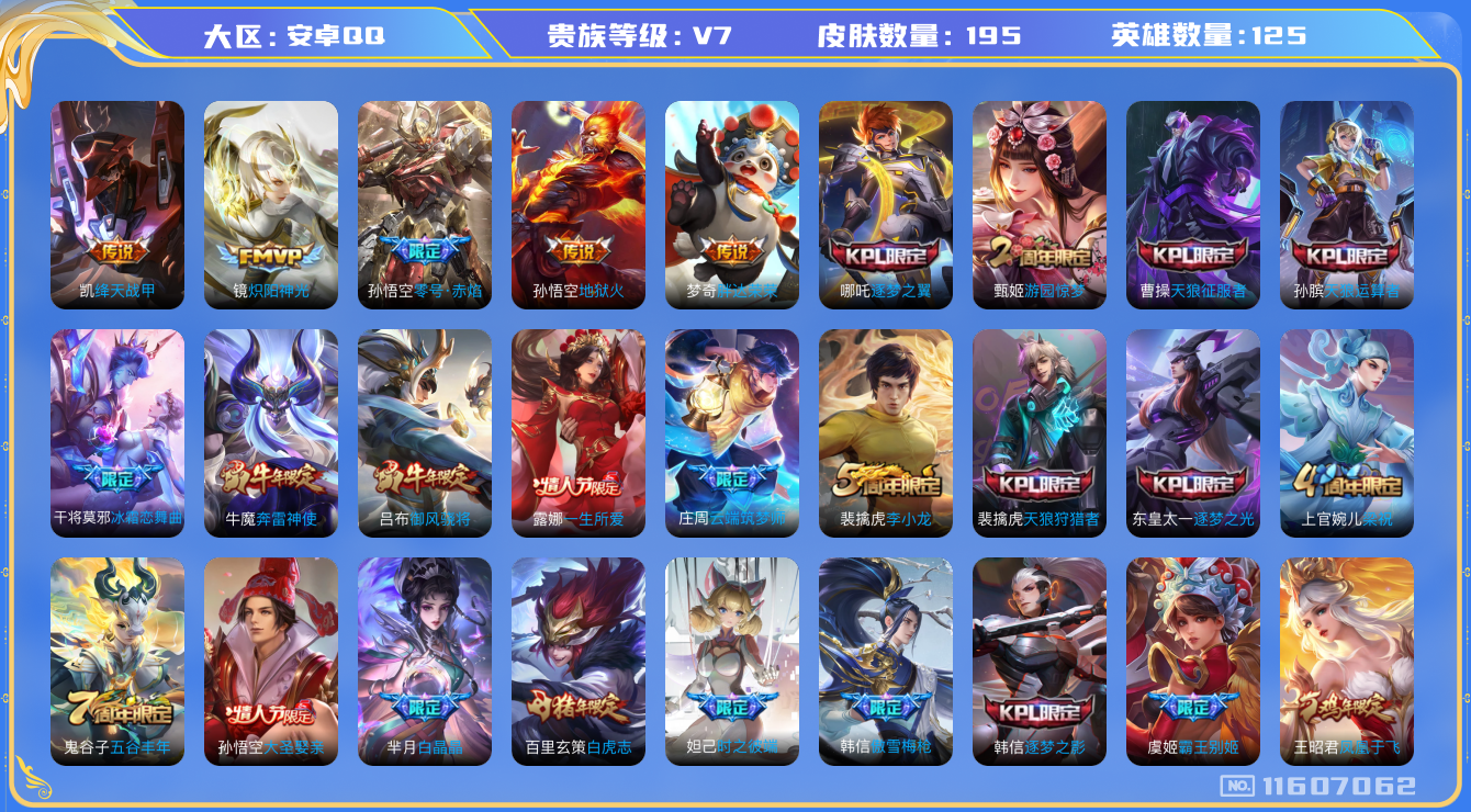 [11607062]V7 7传说 125英雄 195皮肤 典藏英雄武则天 可修改实名 优质装备:绛天战甲(鸡嘴战神),炽阳神光,地狱火,零号·赤焰,胖达荣荣 珍宝阁皮:蔷薇恋人 限定皮:白虎志(电光耗子),凤凰于飞,傲雪梅枪,时之彼端,白晶晶,五谷丰年,武圣,天狼运算者,游园惊梦,梁祝,御风骁将(吕布年限),天狼狩猎者,逐梦之翼,天狼征服者,奔雷神使(牛魔年限),李小龙,逐梦之影,逐梦之光,霸王别姬-虞姬,一生所爱,大圣娶亲,冰霜恋舞曲,云端筑梦师 史诗皮:紫霞仙子,千年之狐,偶像歌手,白蛇,晚萤,龙骑士(小龙虾),乱世虎臣,水果甜心,天才门将,星夜王子,心灵骇客,时之奇旅-安琪拉,功夫厨神,德古拉伯爵,暗隐猎兽者,幽灵船长,心灵战警,舞动绿茵,地狱岩魂,纤云弄巧,繁星吟游(呼啦呼啦),拒霜思,缤纷独角兽,逐浪之夏,水晶猎龙者,圣诞狂欢,鹰眼统帅,魅力维加斯