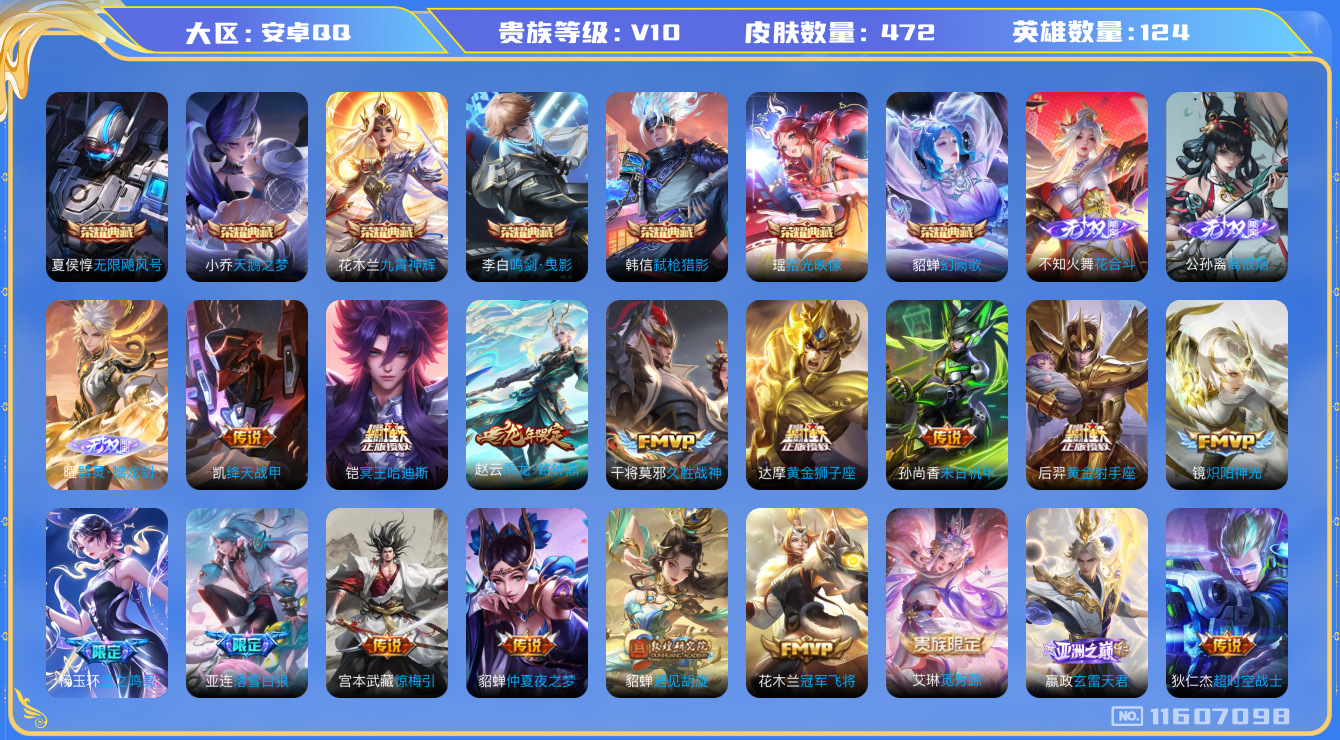 [11607098]V10 7典藏 3无双 48传说 124英雄 472皮肤 可修改实名 优质装备:天鹅之梦(小乔典藏),无限飓风号(高达),鸣剑·曳影,九霄神辉(木兰典藏),幻阙歌(貂蝉典藏),弑枪猎影(韩信典藏),花合斗,离恨烟(公孙离无双),拾光映像(瑶典藏),器灵·螭龙剑,黄金狮子座,黄金射手座,冠军飞将,云鹰飞将(小将军),绛天战甲(鸡嘴战神),久胜战神,炽阳神光,云霓雀翎,末日机甲-孙尚香(绿蚂蚱),地狱火,仲夏夜之梦(大飞蛾),零号·赤焰,飞鸢探春,胖达荣荣,超时空战士-狄仁杰,遇见胡旋,山海·苍雷引(电光曜子),鹤归松栖(云缨),惊梅引,艾琳觅芳踪,玄雷天君 传说皮:乘龙·铭钟鼎(赵云年限),落雪白狼,铠冥王哈迪斯,星之鸣奏,幻光神枪 珍宝阁皮:优雅恋人,蔷薇恋人,女武神,玩趣恶龙 限定皮:愿照·九州拓(澜年限),愿照·福禄聚(蔡文姬年限),愿照·岁时盈(虞姬年限),愿照·山河定(司空震年限),愿照·众生和(妲己年限),愿照·千秋盛(女娲年限),鸣野蒿,夏侯惇霜北刀,至尊宝,白虎志(电光耗子),凤求凰(白切鸡),太华(伽罗年限),异界灵契(白毛香),傲雪梅枪,白鹤梁神女,魔法小厨娘,白晶晶,时雨天司(水龙头),神威(电光马子),瑞麟志(木兰年限),影龙天霄,遇见飞天,高山流水,齐天大圣,五谷丰年,冰锋战神,武圣,天狼运算者,游园惊梦,梁祝,御风骁将(吕布年限),逐梦之星,天狼溯光者,逐梦之音,天狼征服者,祈雪灵祝(雪兔子),李小龙,逐梦之影,朱雀志(守约年限),如梦令-嫦娥,如梦令-后羿,霸王别姬-虞姬,奇迹圣诞,默契交锋-花木兰,孙行者,猪悟能,大圣娶亲,引擎之心,天魔缭乱,青春决赛季,冰霜恋舞曲,云端筑梦师,蜜橘之夏,神奇女侠,美猴王,匿光追影者,寅虎·御盾(廉颇年限),寅虎·瑞焰(虎皮蛋子),寅虎·心曲(虎婆),寅虎·赤拳(老虎年限),深海之息(深海大菠萝),山海·玄木吟(马可年限) 史诗皮:鸭鸭历险记-刘禅,器灵·浮梦炉,糖绘人间,狼魂孤将,化蝶舞,灵蛊蚀心,星界战将,谪仙醉月,龙之律动,石田雨龙,茶境仙,怒海争锋,破空之剑,战舞者,蒙犽顽岩魄,上官婉儿群星魔术团,蔬乡物语(鲁班七号),遇见神鹿,紫霞仙子,苍穹之光,电玩小子(小书包),白龙吟,黄金分割率,特工魅影,千年之狐,江河有灵,匿光侦查者,末日机甲-莱西奥,鹤归松栖(赵怀真),真我赫兹(镜),真我赫兹
