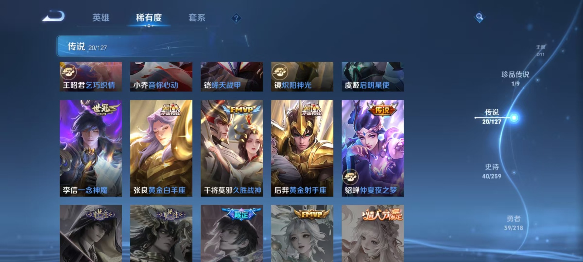 - [11608104]V8 1典藏 22传说 125英雄 117皮肤 可修改实名 优质装备:星空梦想(太空人),黄金射手座,绛天战甲(鸡嘴战神),黄金白羊座,一念神魔,云霓雀翎,地狱火,地狱之眼,乞巧织情,淬星耀世,超时空战士-狄仁杰,无双飞将,音你闪耀(rap皮),记忆之芯(机甲兔),妄想实况,惊梅引,小动物乐团,霜月吟,玄雷天君,涂山容容 传说皮:典韦战鼓燎原 限定皮:映山客,诗剑行 史诗皮:鸭鸭历险记-刘禅,龙之律动,战舞者,百相守梦-百里守约,星界特工,白龙吟,特工魅影,永昼,闲日渔趣,冰冠公主,暗夜猫娘,龙骑士(小龙虾),乱世虎臣,女仆咖啡,摇滚巨星,水果甜心,天才门将,时之奇旅-安琪拉,乐园奇幻夜,舞动绿茵,纤云弄巧,逐浪之夏,月团寄思,水晶猎龙者,箭羽风息,圣诞狂欢,鹰眼统帅,魅力维加斯,天秀·音浪