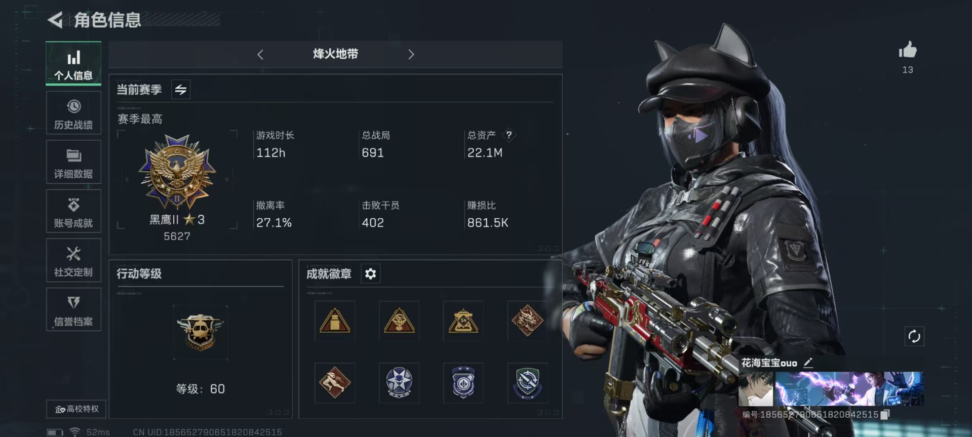 [11607140]总资产:22.1M 2近战传说 22传说枪械 哈夫币:4.521K 高级安全箱(2×3)9.15号到期 可二次 可修改实名 优质装备:近战-黑海,近战-北极星 烽火地带段位:黑鹰 全面战场段位:上等兵 传说武器皮肤:QJB201轻机枪-风林火山,SCAR-H战斗步枪-铁艺苍穹,AK-12突击步枪-夜鹰,SMG45冲锋枪-骑士,M4A1突击步枪-阿米娅,CAR-15突击步枪-阿米娅,复合弓-黑-天际线,AWM狙击步枪-捞点薯条,QCQ171冲锋枪-北极星,腾龙突击步枪-捞点薯条,93R-捞点薯条,AK-12突击步枪-特斯拉线圈,SR-3M紧凑突击步枪-特斯拉线圈,UZI冲锋枪-特斯拉线圈,勇士冲锋枪-能天使-午夜邮差,725双管霰弹枪-送葬人-无题密令,K437突击步枪-北极星,MP5冲锋枪-黑海,QJB201轻机枪-黑海,CAR-15突击步枪-黑鹰坠落 史诗武器皮肤:PKM通用机枪-荒野求生,SR-3M紧凑突击步枪-荒野求生,SVD狙击步枪-荒野求生,MP7冲锋枪-无垢,沙漠之鹰-曙光