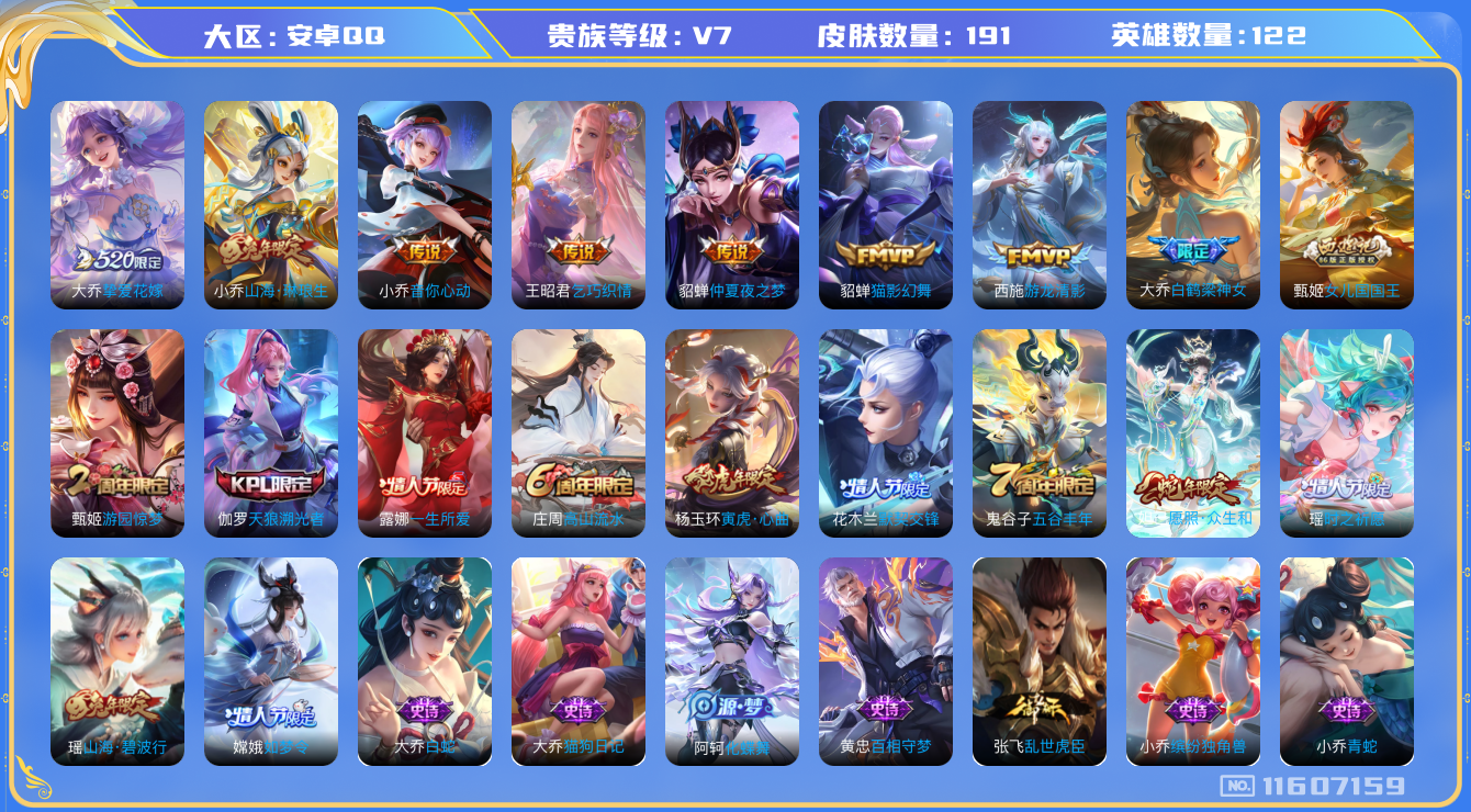 [11607159]V7 9传说 122英雄 191皮肤 可修改实名 女号 优质装备:猫影幻舞,仲夏夜之梦(大飞蛾),音你心动-小乔,乞巧织情,游龙清影(小青龙),挚爱花嫁,山海·琳琅生(小乔年限) 珍宝阁皮:妄想食味,蔷薇恋人 限定皮:愿照·众生和(妲己年限),白鹤梁神女,山海·碧波行(瑶年限),高山流水,五谷丰年,游园惊梦,天狼溯光者,如梦令-嫦娥,默契交锋-花木兰,一生所爱,女儿国国王,寅虎·心曲(虎婆),时之祈愿-瑶(瑶传限) 史诗皮:化蝶舞,石田雨龙,百相守梦-黄忠,遇见神鹿,紫霞仙子,魅语,无限星赏官,青蛇,偶像歌手,白蛇,晚萤,末日机甲-吕布,猫狗日记-孙策,猫狗日记-大乔,时之恋人-孙尚香,乱世虎臣,女仆咖啡,摇滚巨星,水果甜心,星夜王子,心灵骇客,功夫厨神,鬼剑武藏,舞动绿茵,诗语江南,繁星吟游(呼啦呼啦),拒霜思,缤纷独角兽,逐浪之夏,水晶猎龙者,唤灵魅影,金属风暴,圣诞恋歌,鹰眼统帅,无心