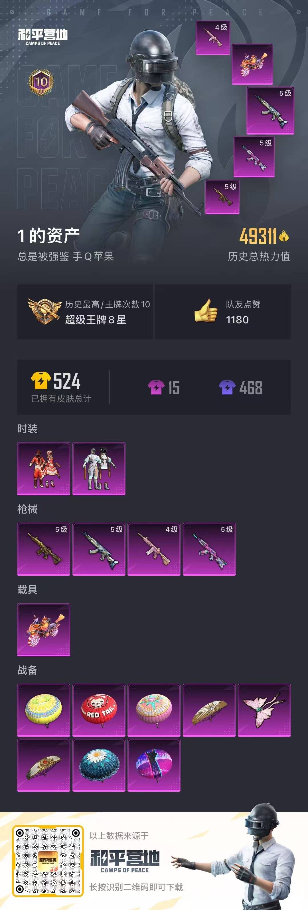 - PX_2095418- 苹果手Q-8王牌印记-5粉装-4特效枪-1载具-61324热力值-157套装-169枪皮-2卓越印记-1传奇印记 【5粉装】,缤纷油彩,荧海星豚,华贵君王,天启纪元,快乐主宰 【4特效枪】AKM-炫紫旋律-7级 M416-五爪金龙-7级 Kar98K-巳巳如意-5级 Mini14-龙虾霸霸-5级 【5稀有紫装】,Mark.06,暗影哥特,雪山精英,浪漫波比,胖达团团, 【