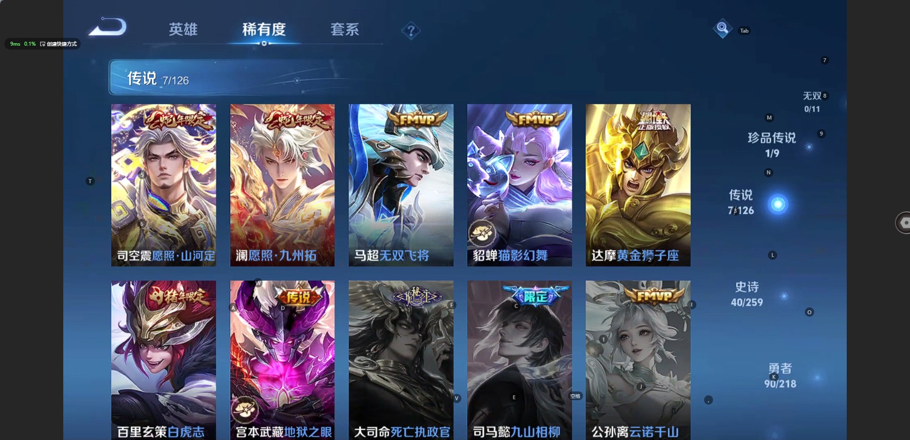 - [12083575]V9 2典藏 25传说 124英雄 320皮肤 可修改实名 优质装备:鸣剑·曳影,全息碎影(猴子典藏),黄金狮子座,黄金射手座,云鹰飞将(小将军),炽阳神光,一念神魔,云霓雀翎,末日机甲-孙尚香(绿蚂蚱),地狱火,仲夏夜之梦(大飞蛾),零号·赤焰,地狱之眼,淬星耀世,超时空战士-狄仁杰,无双飞将,神器·狴犴令,浮生妄,妄想奇谈,澜逐花归海 珍宝阁皮:妄想食味,优雅恋人 限定皮:至尊宝,白虎志(电光耗子),凤求凰(白切鸡),凤凰于飞,白晶晶,时雨天司(水龙头),飞衡(韩信年限),遇见飞天,冰锋战神,武圣,天狼运算者,游园惊梦,梁祝,龙胆,逐梦之星,岱宗(典韦年限),李小龙,逐梦之影,逐梦之光,默契交锋-花木兰,大圣娶亲,天魔缭乱,冰霜恋舞曲,蜜橘之夏,神奇女侠,寅虎·赤拳(老虎年限),神器·万象笔,山海·玄木吟(马可年限) 史诗皮:遇见神鹿,紫霞仙子,苍穹之光,电玩小子(小书包),特工魅影,千年之狐,永昼,江河有灵,魅语,百解令(蒙犽),冰冠公主,青蛇,偶像歌手,晚萤,百相守梦(刘备),暗夜猫娘,猫狗日记-孙策,猫狗日记-大乔,乱世虎臣,节奏热浪,修罗,女仆咖啡,摇滚巨星,水果甜心,天才门将,星夜王子,心灵骇客,功夫厨神,德古拉伯爵,暗隐猎兽者,幽灵船长,鬼剑武藏,暗渊魔法,心灵战警,乐园奇幻夜,舞动绿茵,地狱岩魂,诗语江南,纤云弄巧,拒霜思,缤纷独角兽,乘风破浪,逐浪之夏,水晶猎龙者,曙光守护者,热力回旋,金属风暴,原初追逐者,圣诞狂欢,圣诞恋歌,鹰眼统帅,魅力维加斯,黎明之约,赏金猎手,无心