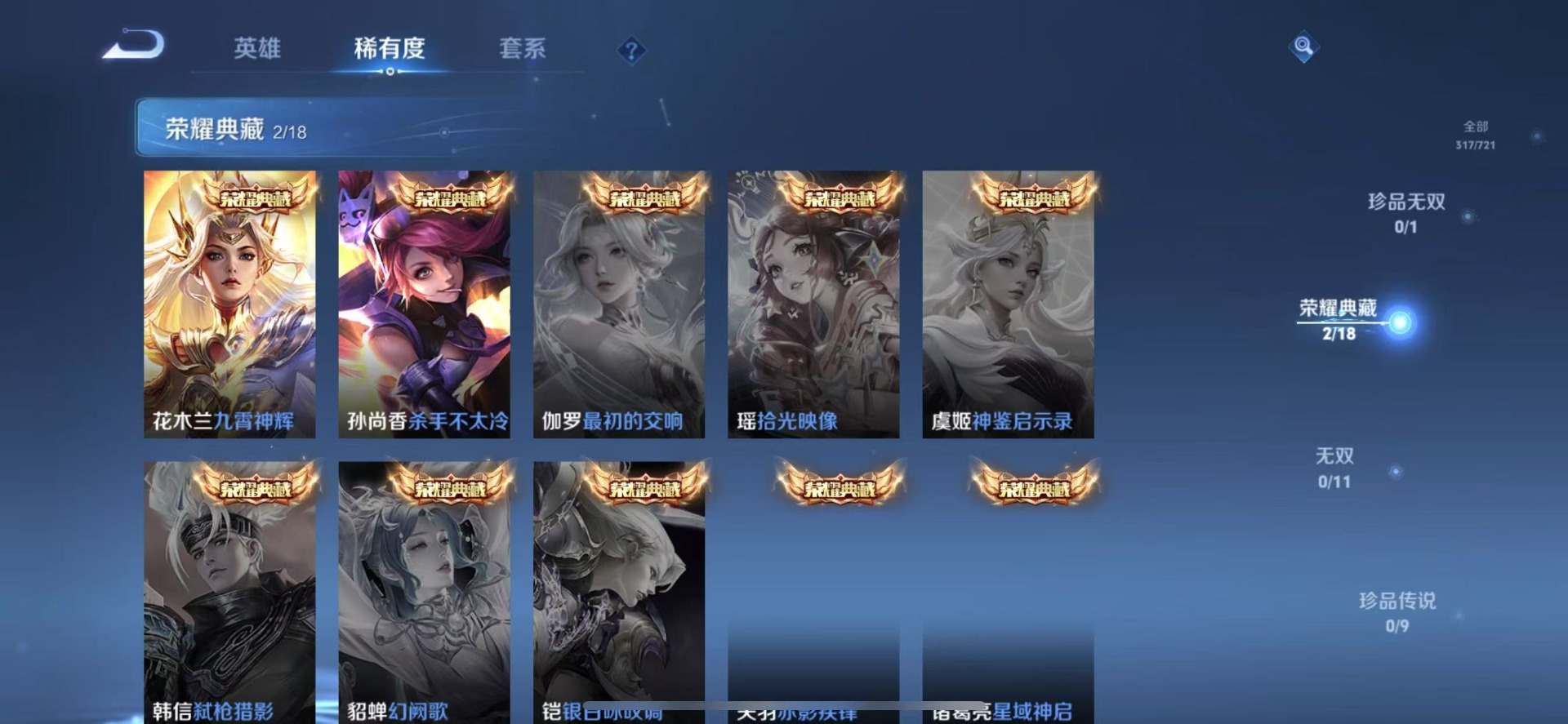 刘邦夺宝奇兵,夏侯惇朔风刀,老夫子醍醐杖,沈梦溪星空之诺,沈梦溪大漠名商,盾山御銮,曹操烛龙,孙膑妖精王,苏烈千军破阵,典韦穷奇,达摩沙漠行僧,牛魔御旌,鲁班七号狮舞东方,吕布猎兽之王,元歌云间偶戏,兰陵王金庭之子,裴擒虎擒涛扼浪,鲁班大师探海日志,明世隐疑决卦,蒙犽狂想玩偶喵,马可波罗暗影游猎,白起狰,鬼谷子原初探秘者,张良古海寻踪,桑启海盐诗旅,狄仁杰万华元夜,嬴政白昼王子,芈月重明,程咬金演武夺筹,扁鹊炼金王,李元芳银河之约,李元芳云中旅人,弈星混沌棋,虞姬凯尔特女王,米莱狄御霄,钟馗神迹守卫,钟馗驱傩正仪,狂铁御狮,太乙真人饕餮