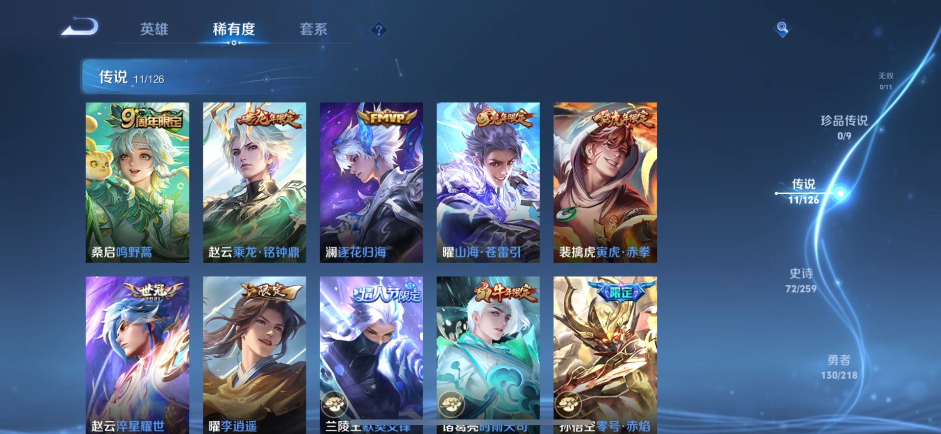 - PX_2095764-贵族等级: V7 英雄数: 125 皮肤数: 132 传说皮: 久胜战神,末日机甲-孙尚香,地狱火 限定皮: 梁祝,辉光之辰,神威,飞衡,凤求凰,至尊宝,五谷丰年,鸣野蒿