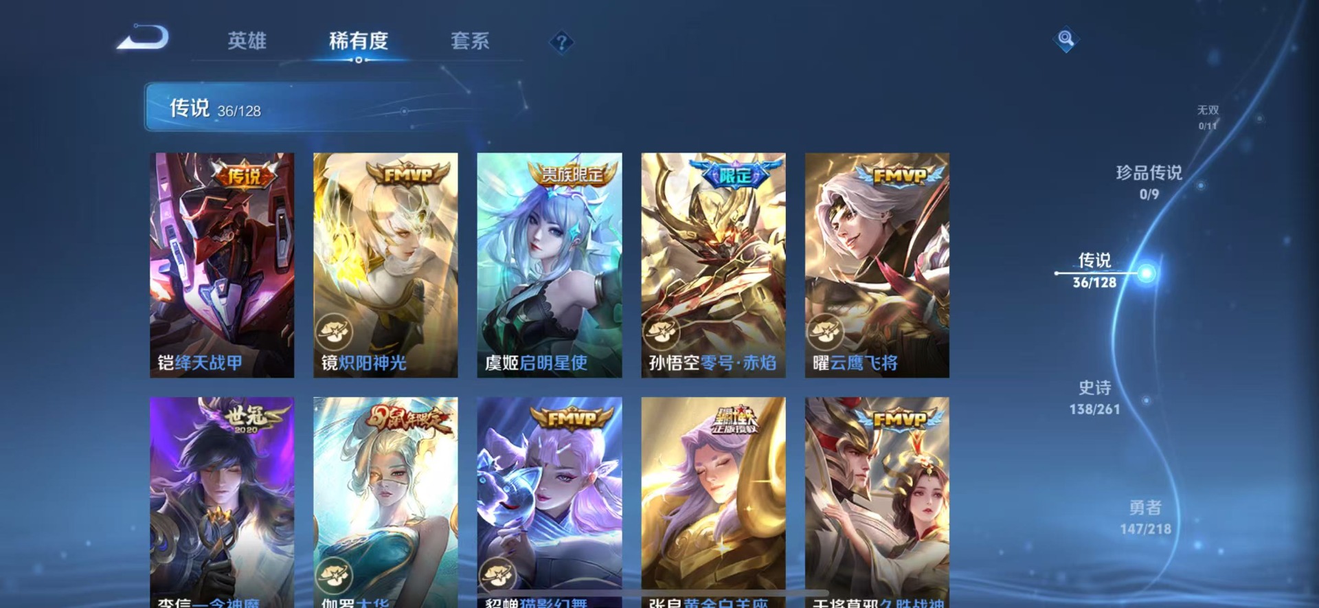 大乔白鹤梁神女,黄忠烈魂,哪吒逐梦之翼,甄姬女儿国国王,铠青龙志,曹操天狼征服者,伽罗天狼溯光者,伽罗太华,苏烈玄武志,张飞虎魄,赵云龙胆,孙膑天狼运算者,干将莫邪冰霜恋舞曲,典韦岱宗,牛魔奔雷神使,鲁班七号乒乒小将,项羽霸王别姬,吕布御风骁将,后羿如梦令,后羿辉光之辰,露娜一生所爱,镜匿光追影者,庄周云端筑梦师,诸葛亮时雨天司,兰陵王默契交锋,公孙离祈雪灵祝,公孙离蜜橘之夏,裴擒虎梅西,裴擒虎李小龙,裴擒虎天狼狩猎者,东皇太一逐梦之光,上官婉儿梁祝,上官婉儿天狼绘梦者,花木兰默契交锋,花木兰瑞麟志,花木兰青春决赛季,安琪拉魔法小厨娘,马可波罗逐梦之星,猪八戒猪悟能,孙悟空大圣娶亲,芈月白晶晶,孙悟空至尊宝,孙悟空美猴王,百里玄策白虎志,马超神威,雅典娜神奇女侠,赵云引擎之心,妲己时之彼端,韩信傲雪梅枪,韩信飞衡,韩信逐梦之影,百里守约朱雀志,蔡文姬奇迹圣诞,虞姬霸王别姬,嫦娥如梦令,王昭君凤凰于飞,关羽冰锋战神