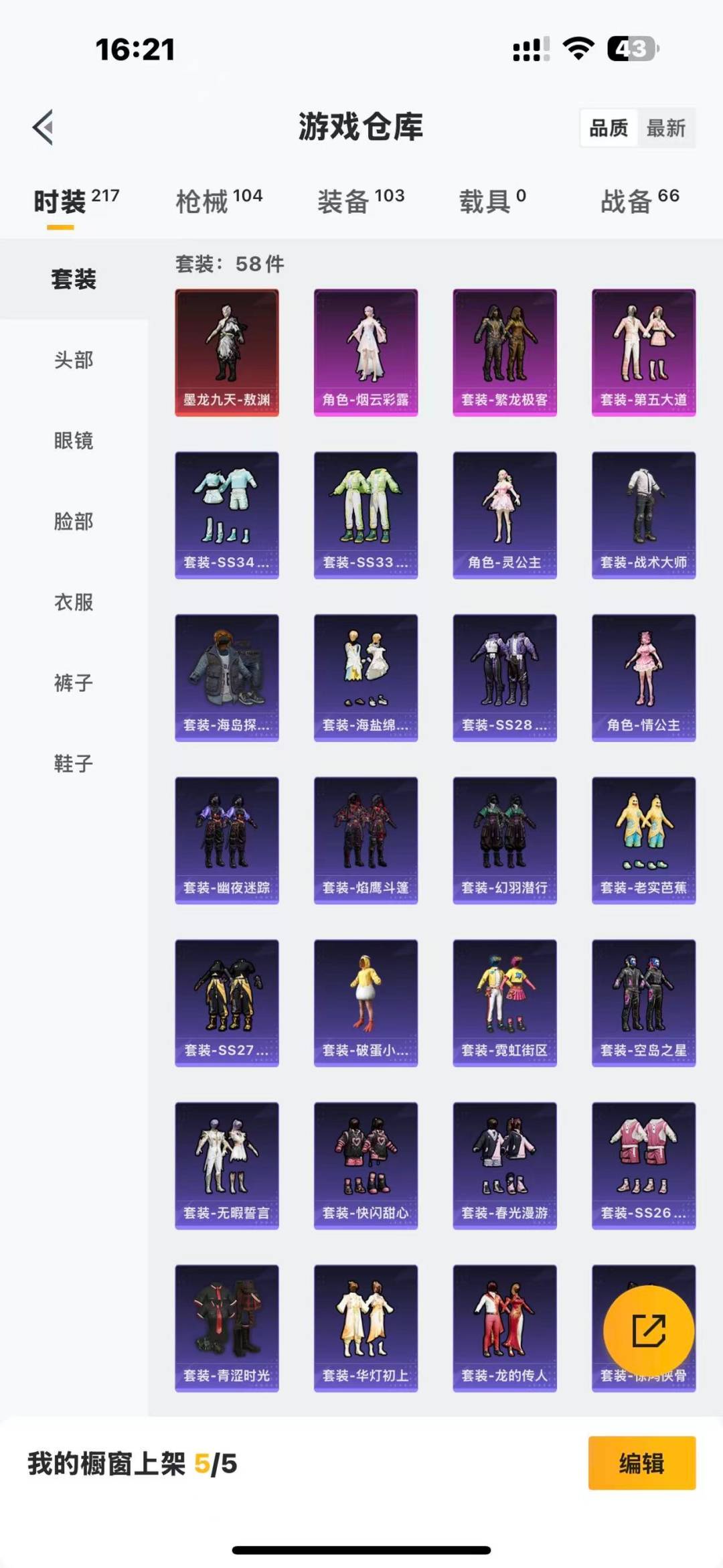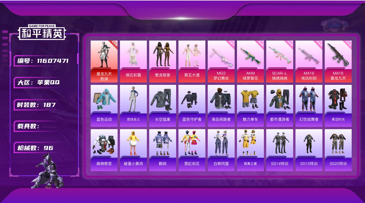 [11607471]1红装 3粉装 5特效枪 8印记 可二次 可修改实名 优质装备:二级墨龙九天-敖渊(2级敖渊2级野人),墨龙九天-敖渊(野人),MG3梦幻舞会,AKM绿萝繁花,SCAR-L-锦绣绵绵,七级MG3-梦幻舞会,M416电玩时刻,M416墨龙九天 热门装扮:第五大道,繁龙极客,烟云彩露 五级特效枪:五级M416-电玩时刻,五级SCAR-L-锦绣绵绵,五级AKM-绿萝繁花 三级特效枪:三级M416-墨龙九天 紫色装扮:SS22特训,莱茵河畔,SS23特训,娇憨猪猪,萌趣咩咩,SS21特训,SS33特训套装,青涩时光,灵公主,SS20特训,SS15特训,SS14特训,都市漫游者,长空猛禽,霓虹街区,蓝色守护者,蓝色运动,魅力单车,鹤鸣,麻辣教官,龙的传人,龟仙人,柠萌假日,海岛探路者,涂山之恋,幻世战舞者,白熊同盟,破蛋小黄鸡,空岛之星,SS28特训,玉兔迎春,竞技名士,情公主,惊鸿侠骨,神气柴柴,懵萌河马,SS24特训(SS24特训套装),SS25特训,锦衣飞扬,焰鹰斗篷,幻羽潜行,幽夜迷踪,SS27特训,无暇誓言,华灯初上,SS26特训,春光漫游,快闪甜心,绯格组合,萌黄之夏 优质战备:墨龙九天降落伞,龙翔九天飞行器,江南烟雨降落伞,莲影清波降落伞,镜域双华降落伞,镜域双华-灵镜之阶,环太平洋降落伞,飒粉甜心降落伞,银刃赛罗降落伞