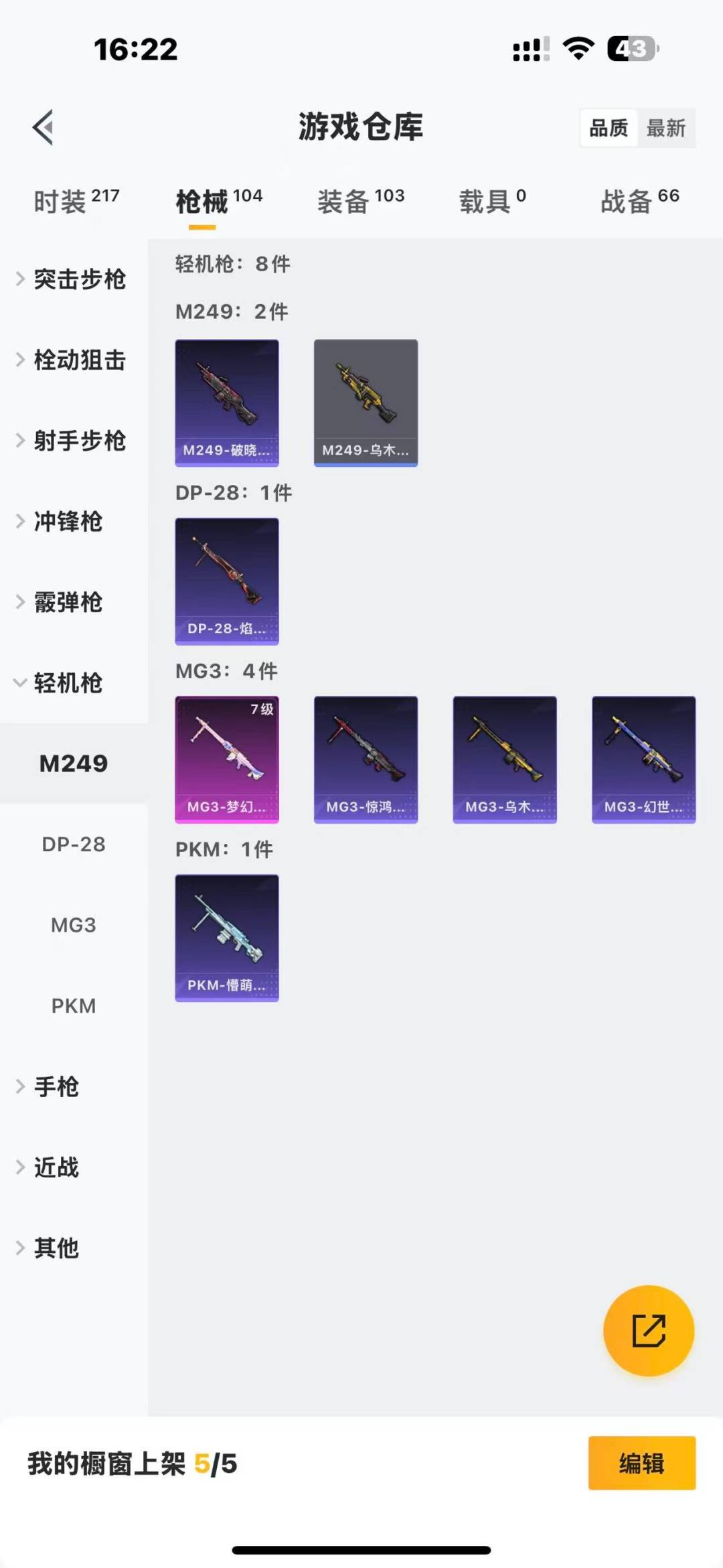 AKM-绿萝繁花,SCAR-L-锦绣绵绵,M416-电玩时刻,M416-墨龙九天,MG3-梦幻舞会