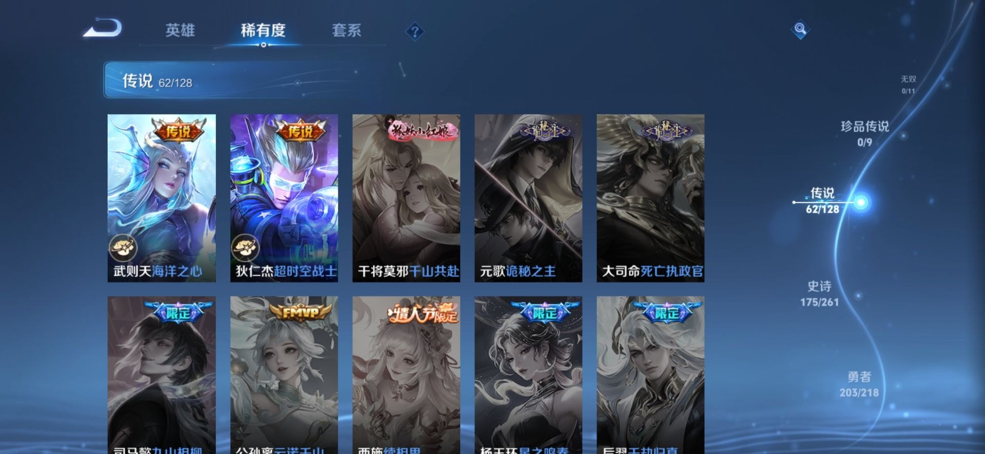 - PX_2104965-Q/至尊星耀/126皮肤/124英雄/1典藏/0珍品无双/0无双/1珍品传说/11传说/39史诗/8稀有英雄 【1 珍品传说】时之奇旅 孙策, 【1 典藏皮肤】弑枪猎影 韩信, 【11 传说皮肤】胖达荣荣 梦奇,碎云 百里守约,云鹰飞将 曜,齐天大圣 孙悟空,仲夏夜之梦 貂蝉,霜月吟 露娜,一念神魔 李信,愿照·九州拓 澜,愿照·山河定 司空震,祥瑞亨通 裴擒虎,鸣野蒿 桑启