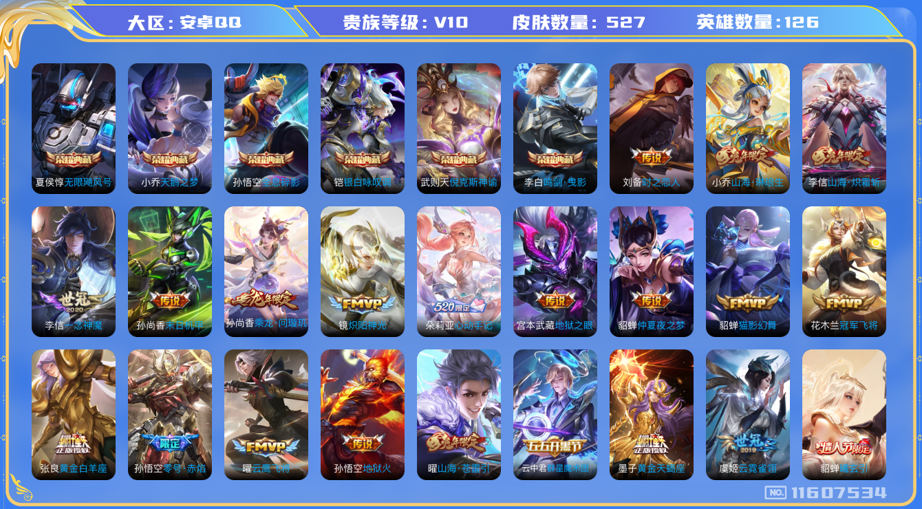 [11607534]V10 6典藏 62传说 126英雄 527皮肤 典藏英雄武则天 可修改实名 优质装备:天鹅之梦(小乔典藏),倪克斯神谕(宇宙婆娘),无限飓风号(高达),鸣剑·曳影,全息碎影(猴子典藏),银白咏叹调(倪克斯侍卫),黄金狮子座,黄金射手座,冠军飞将,云鹰飞将(小将军),绛天战甲(鸡嘴战神),黄金白羊座,猫影幻舞,久胜战神,炽阳神光,一念神魔,云霓雀翎,末日机甲-孙尚香(绿蚂蚱),地狱火,仲夏夜之梦(大飞蛾),零号·赤焰,海洋之心,地狱之眼,飞鸢探春,胖达荣荣,乞巧织情,时之恋人-刘备(电焊工),淬星耀世,超时空战士-狄仁杰,末日机甲-孙策,花朝如约(花篮子),山海·炽霜斩(李信年限),山海·琳琅生(小乔年限),山海·苍雷引(电光曜子),艾琳觅芳踪,金乌负日,黄金天蝎座,云中君群星魔术团,朵莉亚心动手记 传说皮:乘龙·问璇玑(孙尚香年限),乘龙·铭钟鼎(赵云年限),乘龙·淬吴钩(孙策年限),貂蝉曦玄引,吕布曦玄引,典韦战鼓燎原,落雪白狼,幻光神枪 珍宝阁皮:妄想食味,优雅恋人,蔷薇恋人,女武神 限定皮:愿照·九州拓(澜年限),愿照·福禄聚(蔡文姬年限),愿照·岁时盈(虞姬年限),愿照·山河定(司空震年限),愿照·众生和(妲己年限),愿照·千秋盛(女娲年限),逐霄战戟,鸣野蒿,至尊宝,白虎志(电光耗子),凤求凰(白切鸡),凤凰于飞,太华(伽罗年限),梅西,武陵仙君(小桃花),寅虎·展翼(孙膑年限),魔法小厨娘,白晶晶,时雨天司(水龙头),神威(电光马子),飞衡(韩信年限),玄嵩(庄周年限),山海·碧波行(瑶年限),无限倾心-项羽,瑞麟志(木兰年限),遇见飞天,无限倾心-虞姬,齐天大圣,五谷丰年,青龙志(铠年限),冰锋战神,幽恒(沐浴露),武圣,天狼运算者,游园惊梦,梁祝,御风骁将(吕布年限),天狼狩猎者,龙胆,逐梦之翼,逐梦之星,岱宗(典韦年限),天狼征服者,奔雷神使(牛魔年限),祈雪灵祝(雪兔子),天狼绘梦者,李小龙,逐梦之影,逐梦之光,玄武志(苏烈年限),朱雀志(守约年限),永曜之星,辉光之辰,如梦令-嫦娥,如梦令-后羿,霸王别姬-项羽,霸王别姬-虞姬,奇迹圣诞,默契交锋-兰陵王,默契交锋-花木兰,孙行者,猪悟能,一生所爱,大圣娶亲,引擎之心,天魔缭乱,青春决赛季,冰霜恋舞曲,云端筑梦师,蜜橘之夏,热情桑巴,神奇女侠,美猴王,寅虎·御盾(廉颇年限),天降福星,山海·
