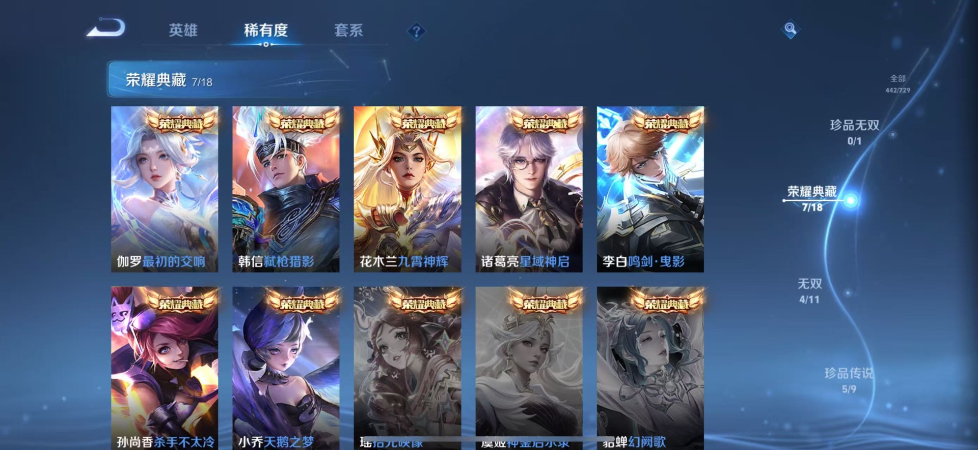 伽罗最初的交响,小乔天鹅之梦,孙尚香杀手不太冷,诸葛亮星域神启,花木兰九霄神辉,李白鸣剑·曳影,韩信弑枪猎影