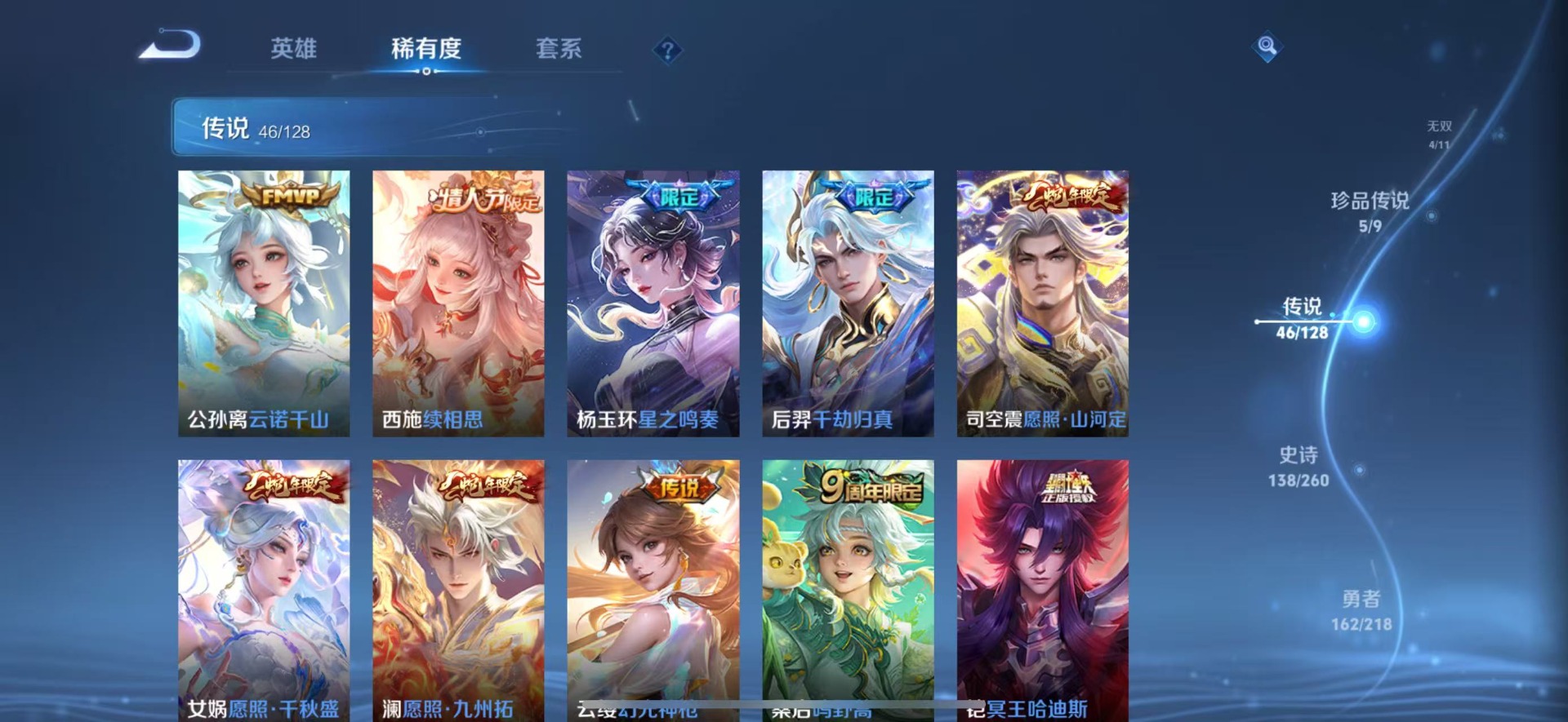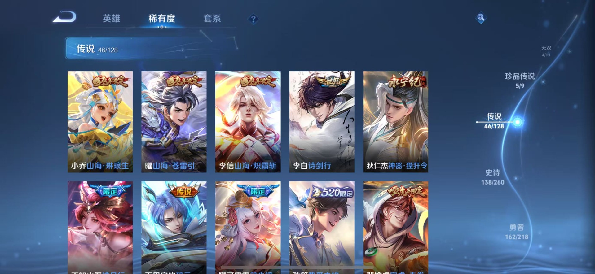 - [12233566]V7 4传说 125英雄 218皮肤 可修改实名 优质装备:末日机甲-孙尚香(绿蚂蚱),涂山容容 珍宝阁皮:玩趣恶龙 限定皮:至尊宝,白虎志(电光耗子),凤求凰(白切鸡),游园惊梦,梁祝,天狼狩猎者,天狼绘梦者,李小龙,朱雀志(守约年限),如梦令-后羿,霸王别姬-虞姬,天魔缭乱 史诗皮:鸭鸭历险记-刘禅,龙之律动,琥珀纪元伽罗,星界战将,石田雨龙,百相守梦-黄忠,蔬乡物语(鲁班七号),紫霞仙子,电玩小子(小书包),黄金分割率,特工魅影,千年之狐,江河有灵,青蛇,高渐离燃音魔法,乱世虎臣,女仆咖啡,水果甜心,星夜王子,心灵骇客,功夫厨神,德古拉伯爵,暗隐猎兽者,幽灵船长,鬼剑武藏,心灵战警,乐园奇幻夜,纤云弄巧,繁星吟游(呼啦呼啦),缤纷独角兽,乘风破浪,逐浪之夏,水晶猎龙者,曙光守护者,原初追逐者,圣诞狂欢,圣诞恋歌,鹰眼统帅,王者之锤,魅力维加斯,黎明之约,未来纪元-赵云