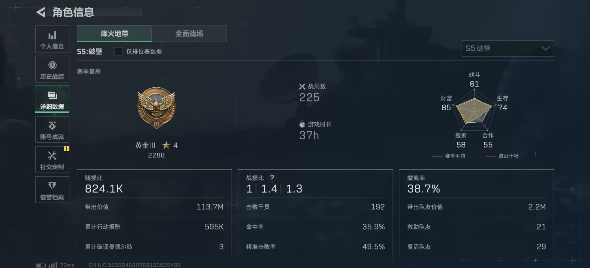 [11607582]总资产:50.3M 7传说枪械 哈夫币:18.611K 进阶安全箱(9.17到期) 可二次 可修改实名 烽火地带段位:黄金 全面战场段位:无段位 传说武器皮肤:M4A1突击步枪-阿米娅,CAR-15突击步枪-阿米娅,复合弓-黑-天际线,AWM狙击步枪-捞点薯条,腾龙突击步枪-捞点薯条,93R-捞点薯条,勇士冲锋枪-能天使-午夜邮差 史诗武器皮肤:勇士冲锋枪-深海恐惧,SG552突击步枪-深海恐惧,SV-98狙击步枪-林中猎手,M250通用机枪-囚徒,SV-98狙击步枪-囚徒