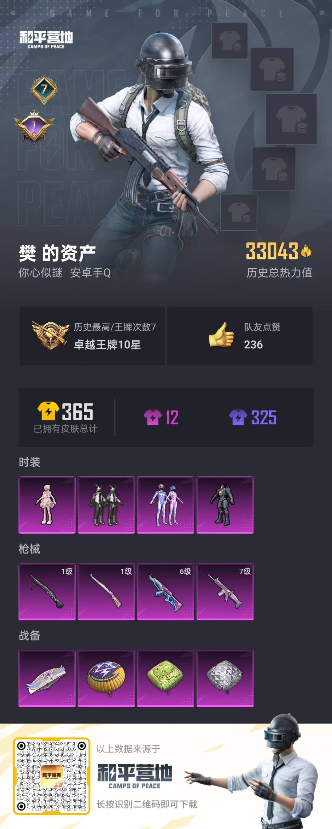 - PX_2102604-可二次 等级56 67套装 101枪皮 4王牌印记 热力值31436 2载具 2粉 2特效枪 玛莎拉蒂Ghibli(粉) 合金龙骨(绿) 满级M416-心之恋语 满级Kar98K-巳巳如意 圣堂之誓 纯珍童话 深海小丑鱼 套装-呆萌铁蟹 角色-情公主 辉耀战神全套头盔 辉耀战神全套背包