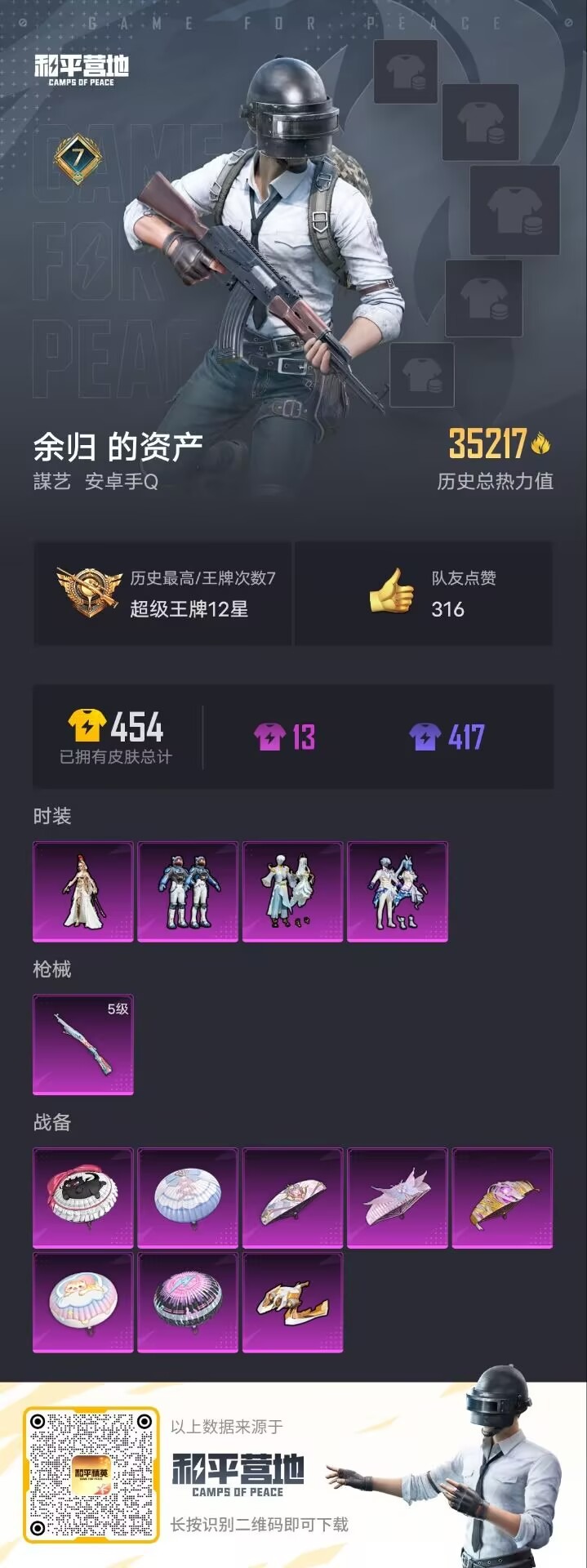 - PX_2101010-??/枪械4/装备309/载具1/战备165/王牌印记11/热力值76959/七级AKM-星际浪客/七级汤姆逊-怪笑疯兔/七级野牛-青空秋雨/五级Kar98K-巳巳如意/星梦玉骢/蝶舞迷情/炙焰赤龙/山涧鹿灵/洛天依/橘柚倾心/旋转彩虹/冰川幽秘/冰川红玫/光明术士/音爆索尼克/未来歌姬/角色-电磁星/角色-守护天翼/角色-冰域雷影/套装-龟仙人/套装-雏菊兔兔/套装-萝兰蝴
