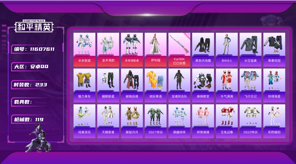 [11607611]4粉装 1特效枪 7印记 可二次 可修改实名 优质装备:未来领航者,萨利娅,Kar98K-巳巳如意 热门装扮:未来歌姬,金丰海韵 五级特效枪:五级Kar98K-巳巳如意 紫色装扮:田园牧歌,轻风白浪,和煦暖阳,SS22特训,SS23特训,娇憨猪猪,萌趣咩咩,SS21特训,SS31特训套装,SS33特训套装,豚鼠丹丹,天籁歌者,长空猛禽,青春校园,缤纷果语,耀眼新星,飞行日记,魅力单车,麻辣教官,黑色伏地魔,龙的传人,龟仙人,冰河战士,龙魂突击队,香桃花海,柠萌假日,破晓战魂,空岛之星,牛气满满,狂花道·雅典娜,白光莹,纯真浪花,热情海星,SS28特训,冰公主,鱼渊荷华,玉兔迎春,燕燕于飞,竞技名士,果汁能量,惊鸿侠骨,SS24特训(SS24特训套装),SS25特训,源星混沌,锦衣飞扬,焰鹰斗篷,幻羽潜行,幽夜迷踪,SS27特训,无暇誓言,晨曦薄雾,SS26特训,春光漫游,快闪甜心,贝斯之夜,大橘大利,星渊小夜曲,SS32特训服(SS32特训套装),蜜桃派对,恋语绒绒,光之冒险 优质战备:精灵梦叶罗丽降落伞,江南烟雨降落伞,萌物绒绒降落伞,超新星降落伞,蜜语绒猫降落伞,沙丘之主降落伞,绯穹魔姬降落伞,拂晓神骑飞行器
