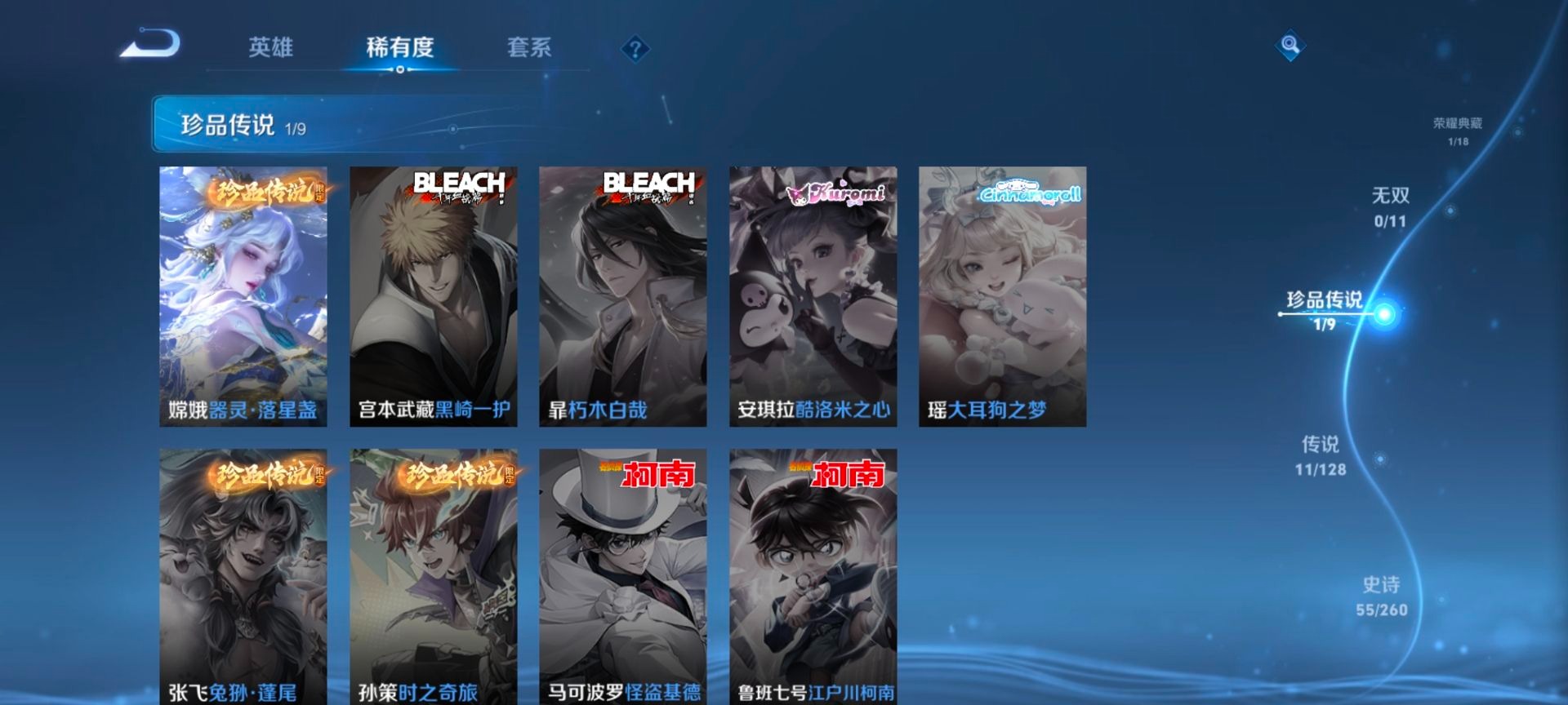 - [12143659]V7 1典藏 2珍品传说 9传说 125英雄 242皮肤 可修改实名 优质装备:鸣剑·曳影,朽木白哉,黑崎一护,炽阳神光,淬星耀世,超时空战士-狄仁杰,无双飞将,电玩·雷克斯,澜逐花归海,涂山容容 传说皮:幻光神枪 珍宝阁皮:万物之道,优雅恋人,玩趣恶龙 限定皮:愿照·九州拓(澜年限),鸣野蒿,神威(电光马子),遇见飞天,高山流水,五谷丰年,梁祝,李小龙,朱雀志(守约年限),大圣娶亲,山海·玄木吟(马可年限) 史诗皮:化蝶舞,灵蛊蚀心,星界战将,龙之律动,石田雨龙,破空之剑,蒙犽顽岩魄,百相守梦-黄忠,紫霞仙子,电玩小子(小书包),特工魅影,千年之狐,江河有灵,真我赫兹(镜),魅语,百解令(蒙犽),蒙恬荣光圣徽,冰冠公主,末日机甲-吕布,猫狗日记-大乔,时之恋人-孙尚香,乱世虎臣,节奏热浪,修罗,摇滚巨星,水果甜心,绅士熊喵,星夜王子,暗隐猎兽者,幽灵船长,鬼剑武藏,心灵战警,地狱岩魂,纤云弄巧,缤纷独角兽,乘风破浪,逐浪之夏,水晶猎龙者,金属风暴,原初追逐者,圣诞狂欢,圣诞恋歌,鹰眼统帅,魅力维加斯,黎明之约,赏金猎手,无心,未来纪元-赵云